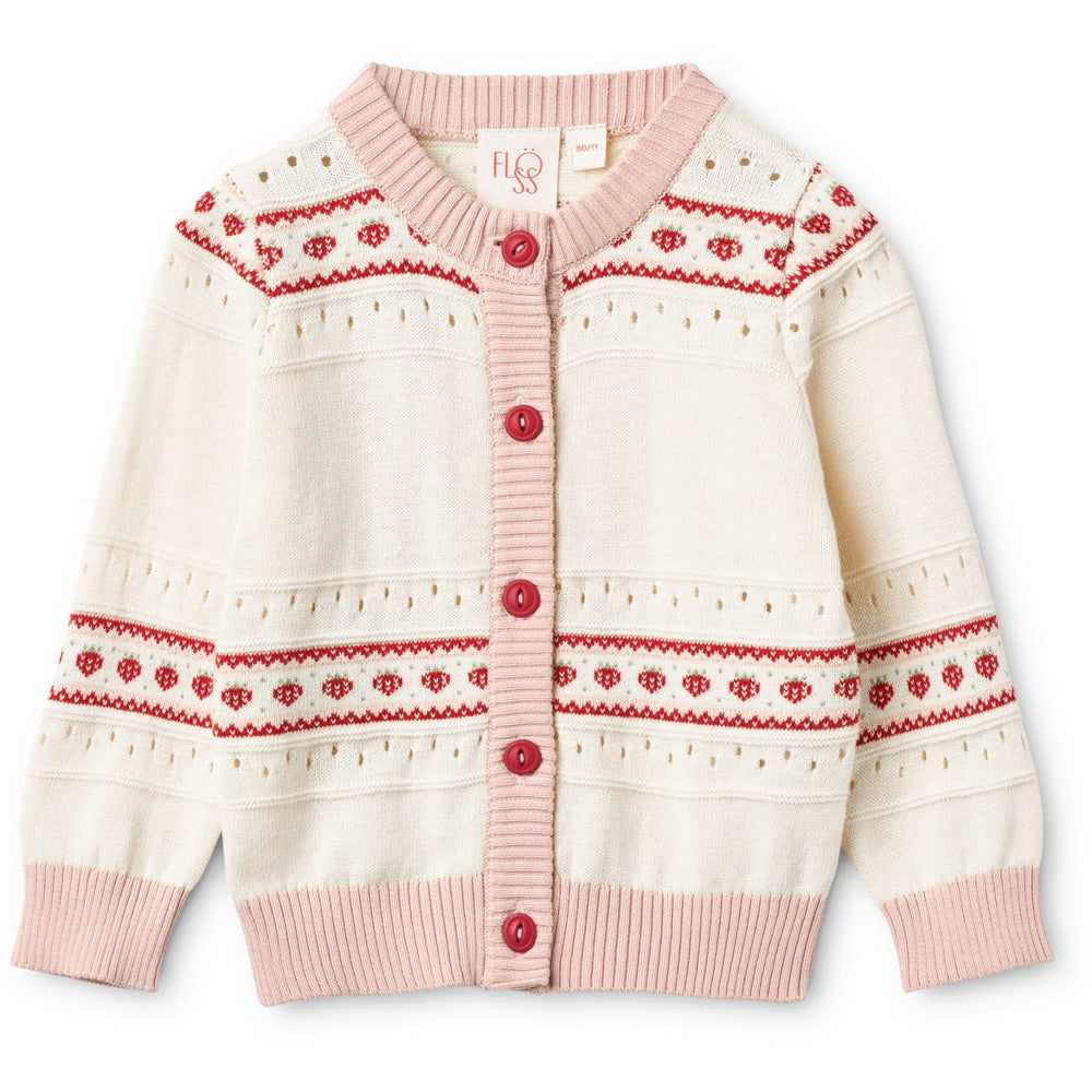 Introducing the charming Flöss Soft White/Berry Stripe Lelou Cardigan, perfect for your little one! Crafted from soft cotton pointelle knit adorned with an adorable strawberry pattern, this cardigan features a contrasting soft pink rib and a secure front closure with delightful red buttons. Ideal for layering, it combines style and comfort with its snug fit and easy-care fabric, promising both durability and effortless maintenance. Your child will love wearing this eye-catching yet cozy cardigan on any occasion!
