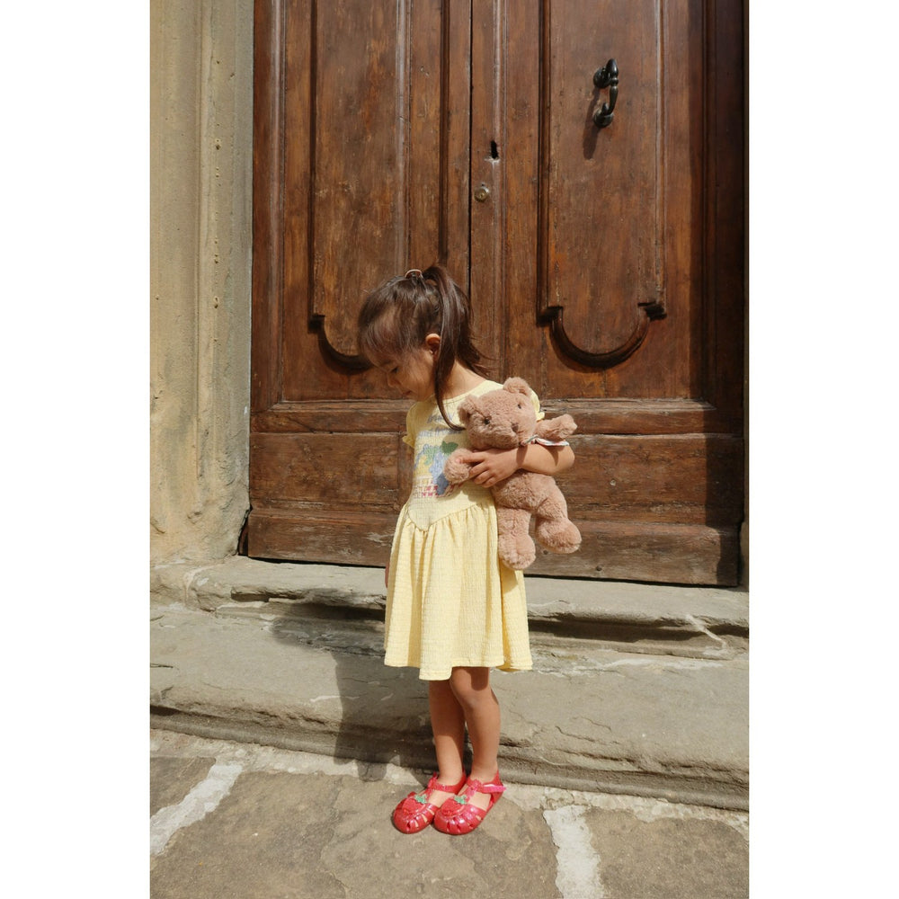 Step into summer fun with our Konges Sløjd Strawberry Lilo Sandals! Perfect for tiny adventurers, these sparkling beach sandals are crafted from durable PVC and feature a handy velcro closure for easy adjustments by little hands. Each sandal is adorned with a delightful Konges Sløjd cherry embellishment—give it a gentle squish to see the glitter whirl! Designed to combine style with comfort, these sandals promise a snug fit and effortless wear, ensuring your little one can play and explore in complete comfort. Effortless to maintain, they're ideal for both sandy shores and backyard play.