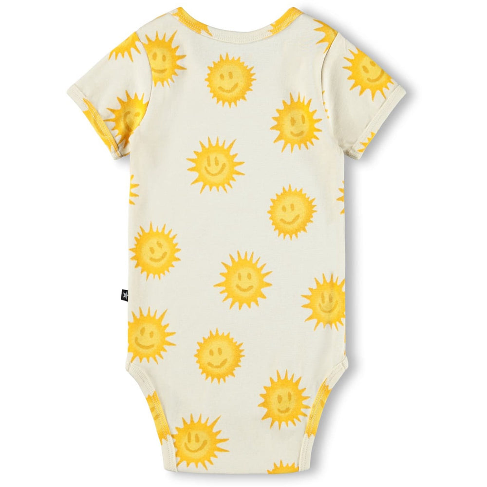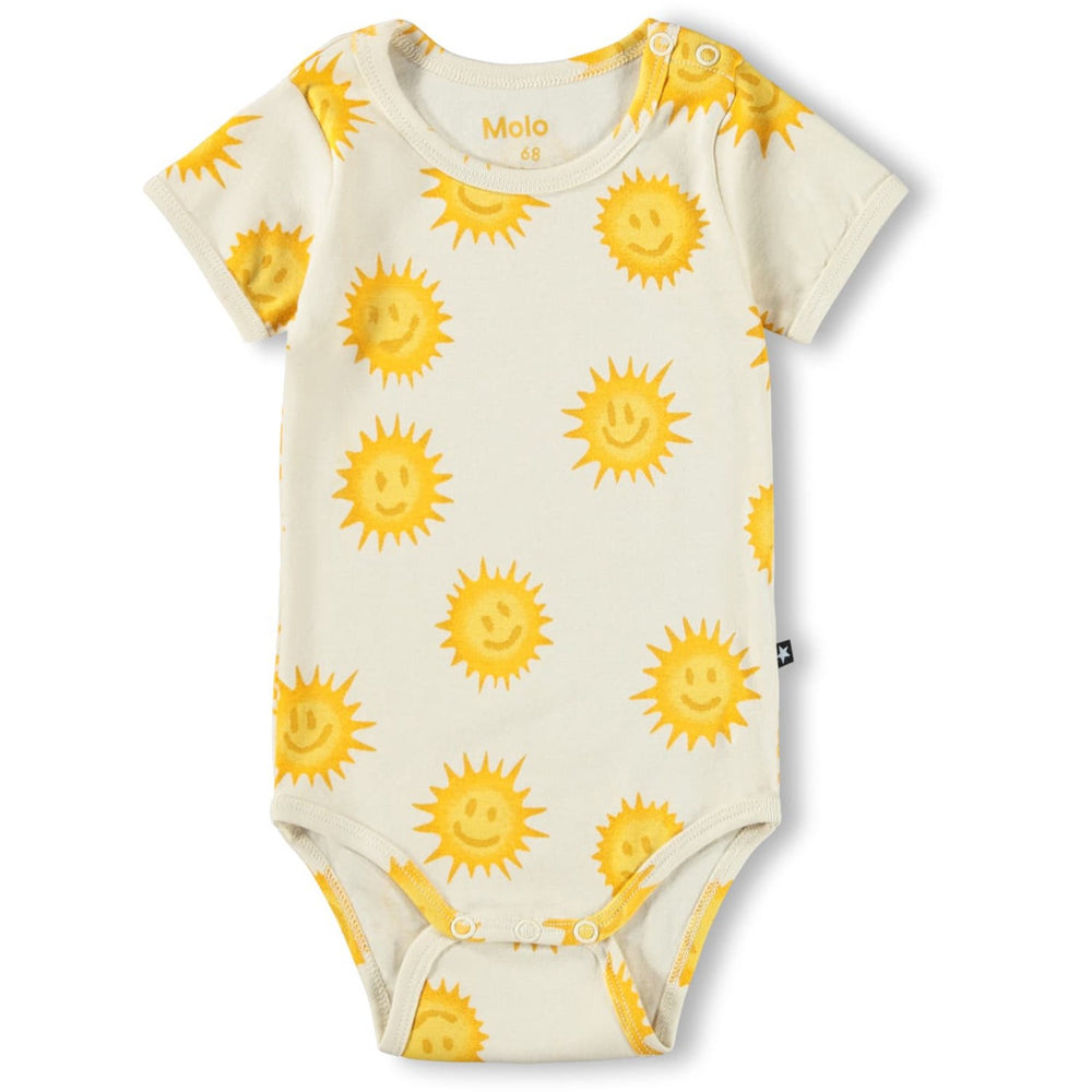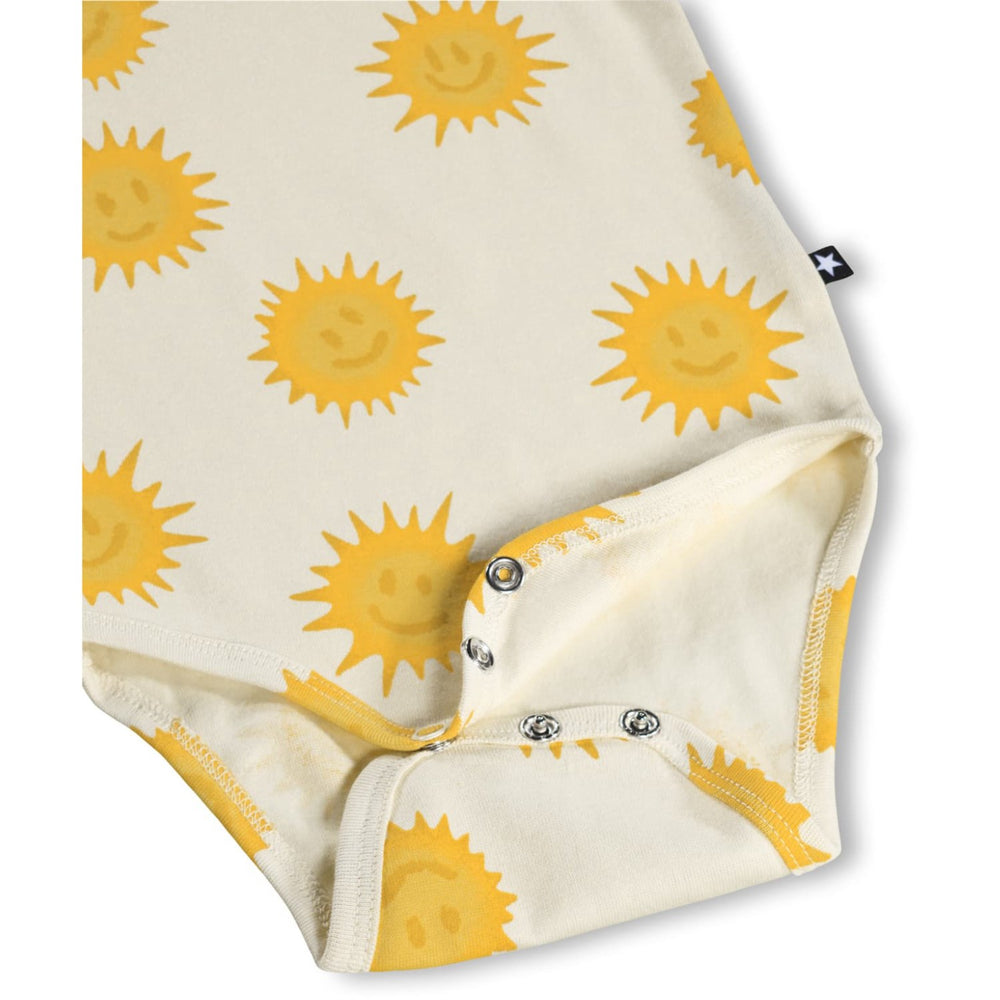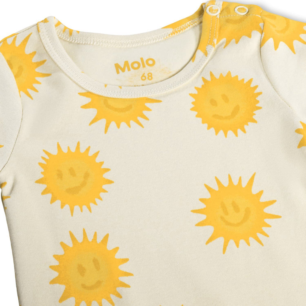 Dress your little one in comfort and style with the Molo Shining Suns Fossie Bodystocking. This charming bodysuit features a vibrant suns pattern on a soft, breathable material, perfect for delicate skin. Tailored for a snug fit, it ensures easy movement and hassle-free changes. Ideal for everyday wear, it promises durability and endless style. Materials: 95% Organic Cotton / 5% Elastane