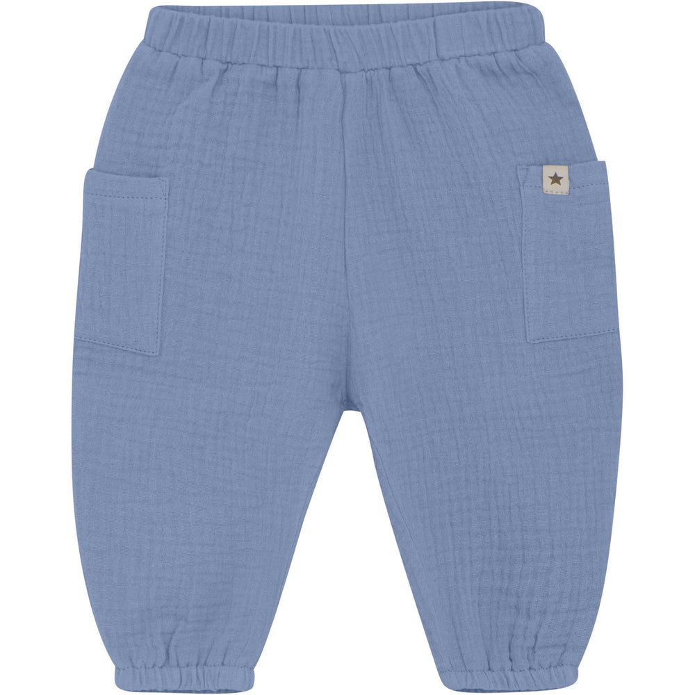 Boasting a stylish yet understated "Quiet Harbor" color, the pants feature a versatile pattern that pairs effortlessly with various tops and shoes. Available in multiple sizes, they are designed to accommodate growing children while maintaining a snug and flattering fit. The breathable muslin ensures these pants are comfortable to wear all day, whether at play or at rest.