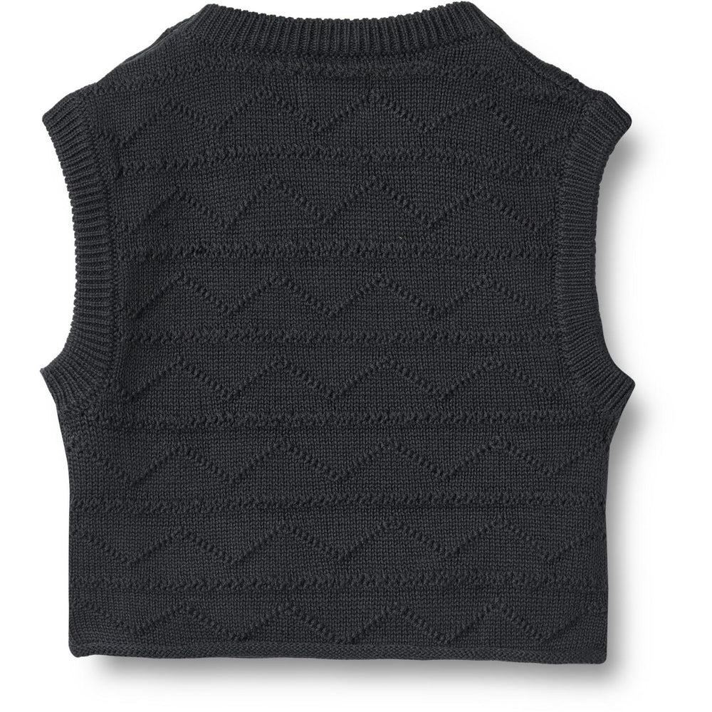 Introducing the Wheat Navy Knit Vest Bobby, an endlessly cozy addition to your little one's wardrobe. Crafted from 100% organic cotton, this vest is notable for its softness and certified by both GOTS and Standard 100 by OEKO-TEX® to ensure no harmful substances are present. Featuring a charming zigzag knit pattern at the front and a practical shoulder opening, its design combines comfort with ease of dressing.