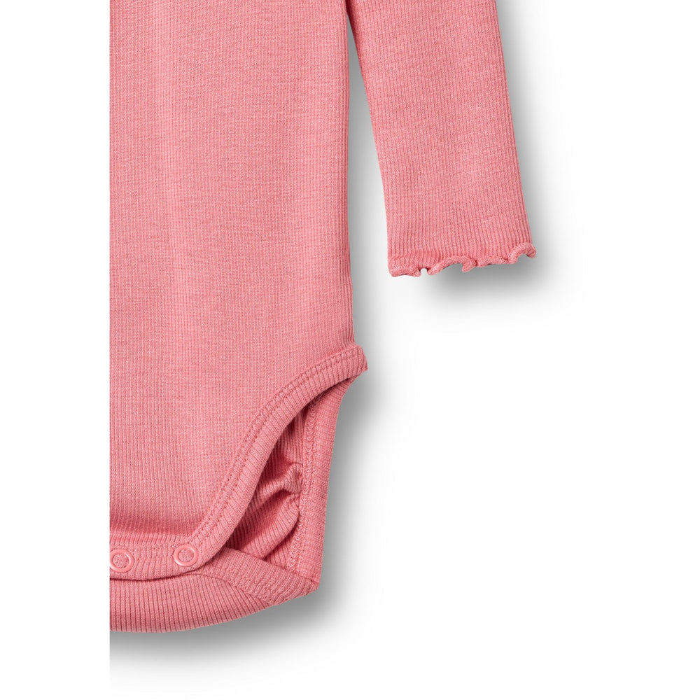 Discover the charm and comfort of Wheat's Soft Pink Rib Body L/S Lotta, expertly crafted for the delicate skin of infants. This cozy long-sleeved bodysuit, made from a blend of 48% organic cotton, 48% Modal, and 4% Elastane, ensures a soft and stretchable fit, perfect for your baby's everyday adventures. Adorned with elegant lace details at the neckline and gentle gathering at the front, it combines style with practicality.