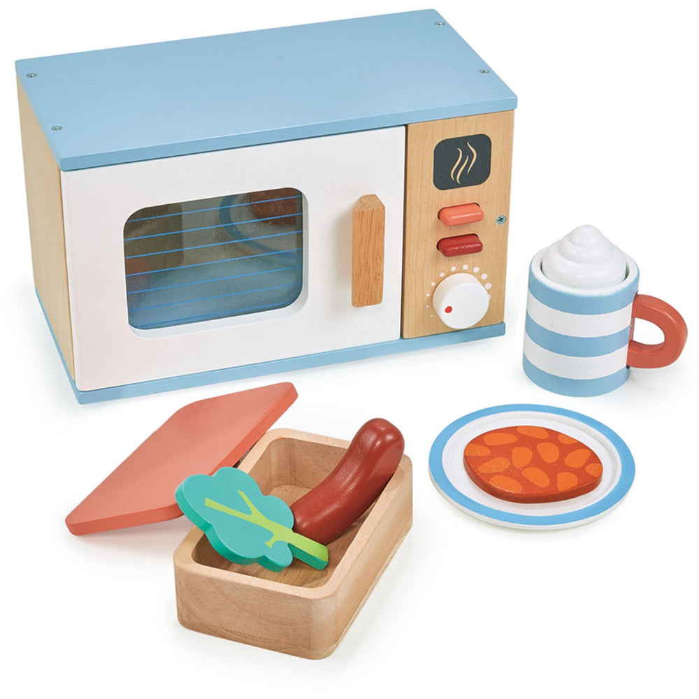Spark your child's culinary creativity with the Mentari Wooden Pretend Play Microwave! Perfect for kids eager to explore cooking, this toy comes with a functional door, a turning knob, and interactive buttons to simulate a real kitchen experience. Safe and sturdy, it includes a cup with removable whipped cream, a plate, and food items like sausage, broccoli, and baked beans. Ideal for little chefs aged 3 and up, it encourages safe play, nurtures problem-solving skills, and is easy to store and clean. Watch as your child whips up delightful pretend meals, learning and growing in the process!