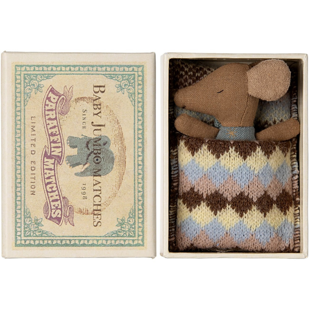 This cute Maileg mouse is ready for hours of play and sleeps well in the matchbox when the game is over. The clothes and bedding come in unique patterns and beautiful colors.