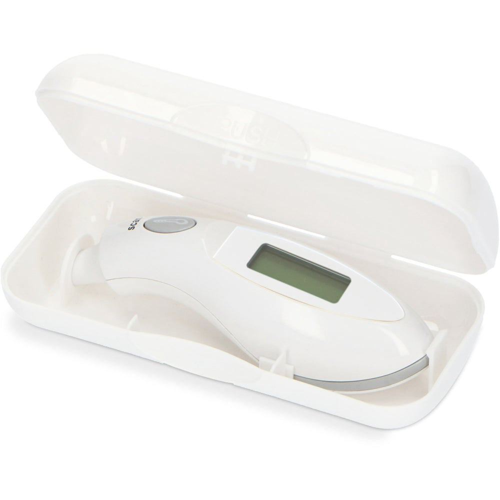 This ergonomic thermometer is accompanied by a practical storage box, enhancing its portability and ensuring it remains safeguarded when not in use or while traveling. It runs efficiently on a battery (included), ensuring it is always ready for use.
