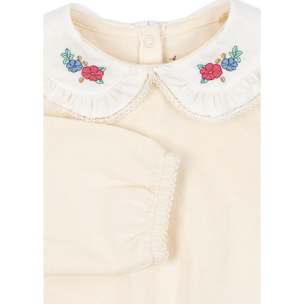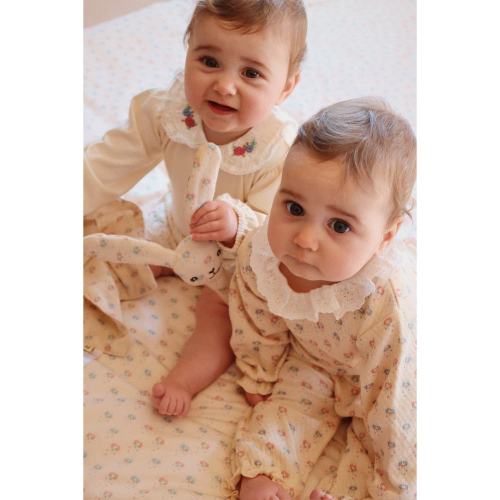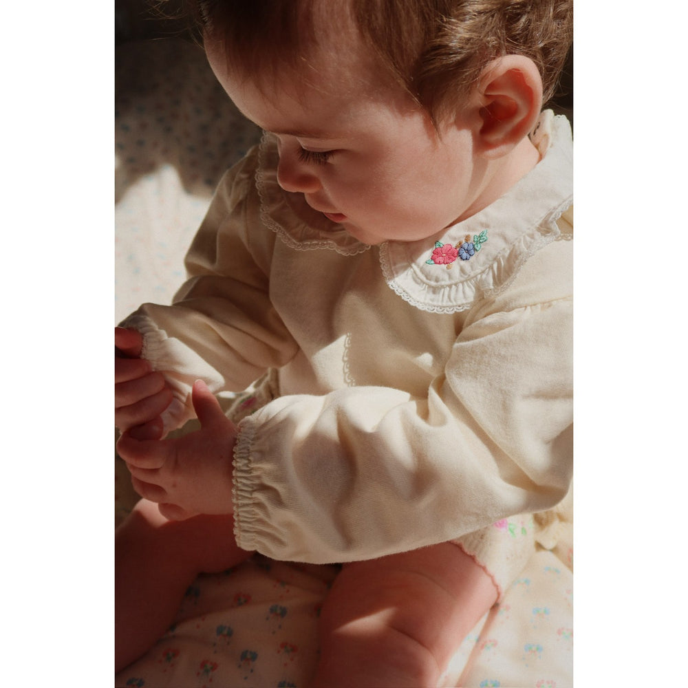 Introduce your little one to the charming Konges Sløjd Antique White Pami Body, crafted from soft, 100% organic GOTS-certified cotton for ultimate comfort. This enchanting bodysuit features a delicate lace collar and beautifully embroidered flowers, adding a touch of elegance. Designed for convenience, it includes snap buttons at the back to simplify dressing. Its durability and ease of care make it a practical choice for everyday wear, ensuring your child both looks adorable and feels comfortable.