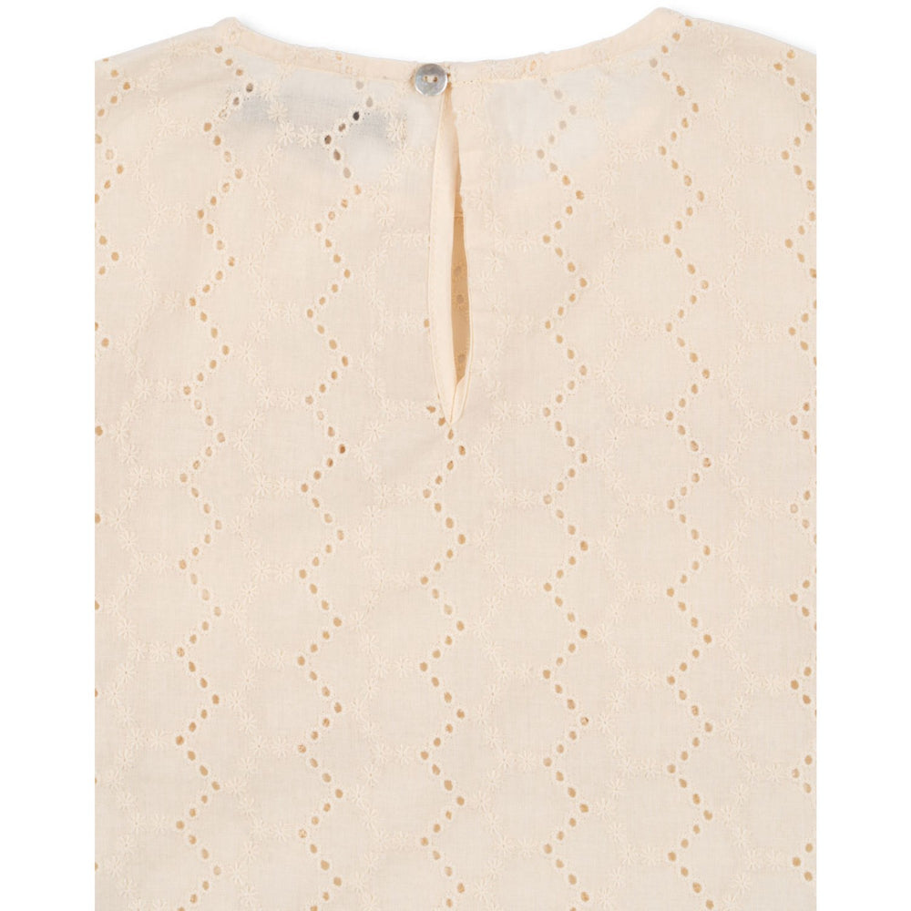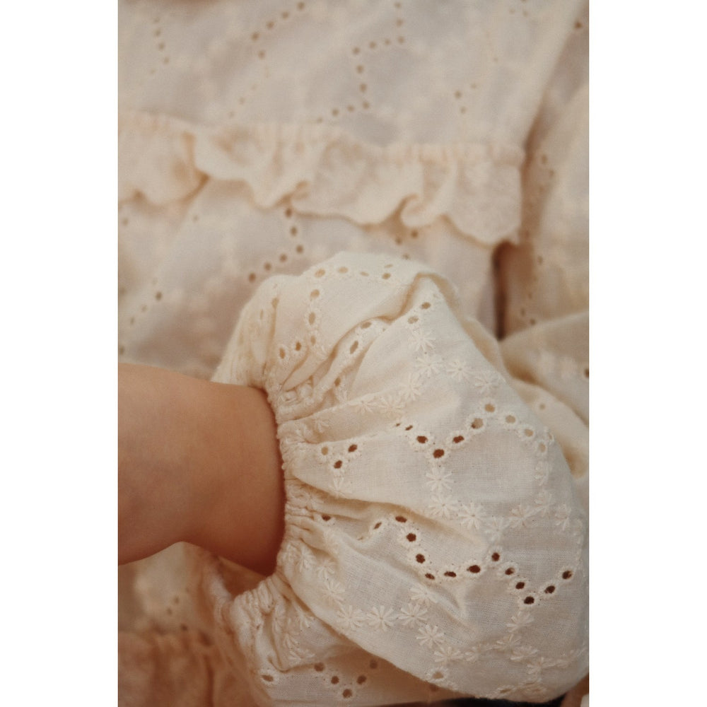 Introducing the Konges Sløjd Buttercream Frilla Dress – a pure cotton creation that boasts detailed broderie anglaise and charming all-over frill. This dress shines with its timeless design, featuring elasticated cuffs for a comfortable fit. Crafted from soft, 100% cotton, it ensures durability and ease of care. Perfect for any occasion, it offers both style and comfort for your little one.