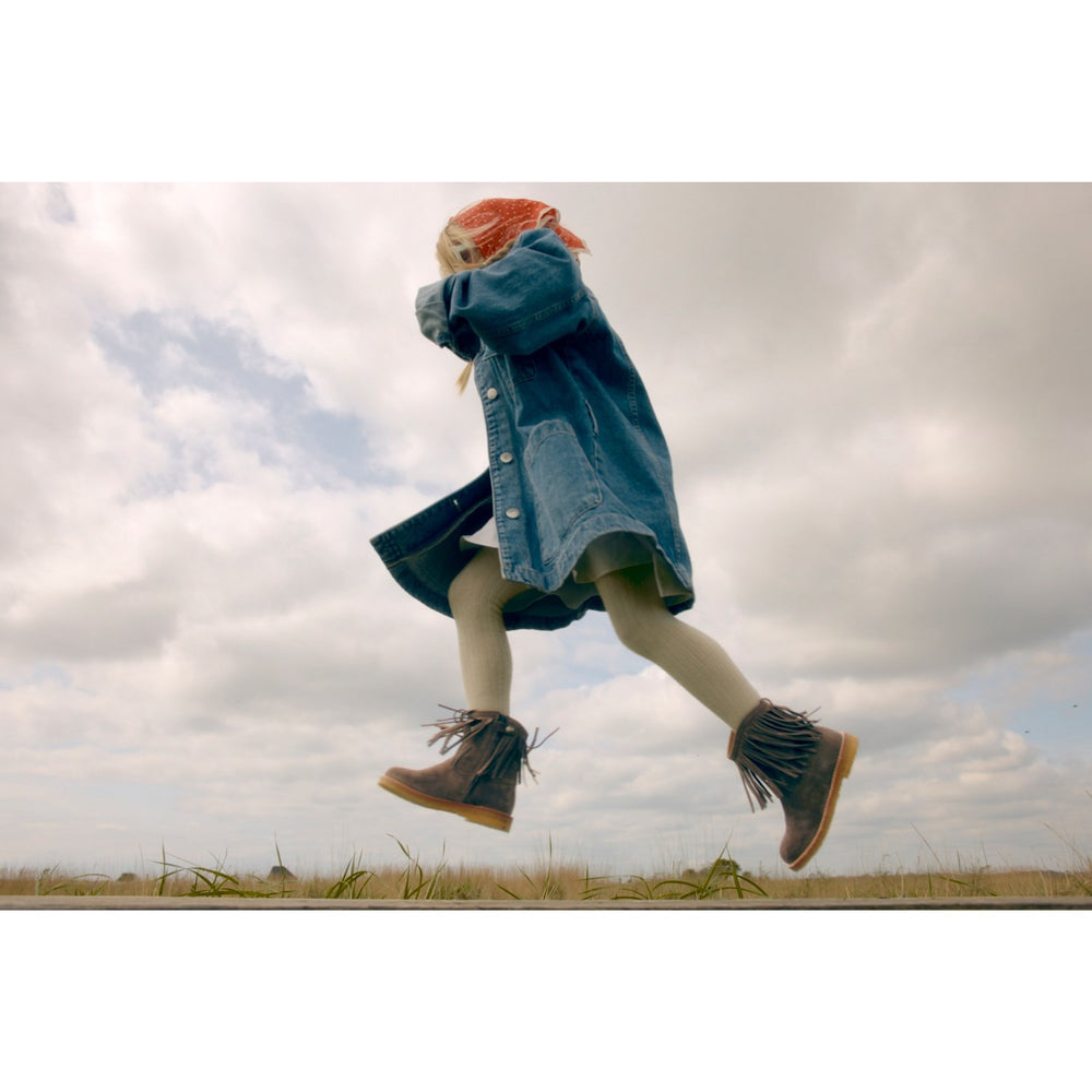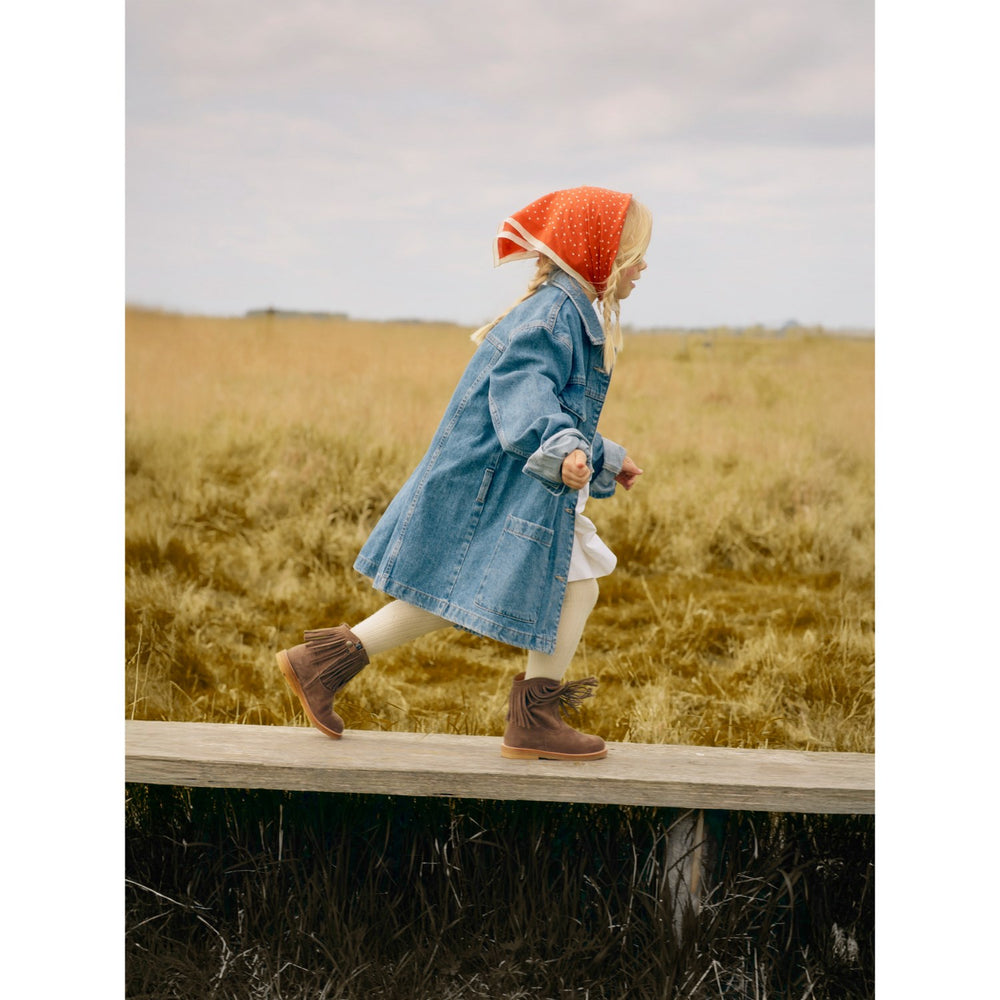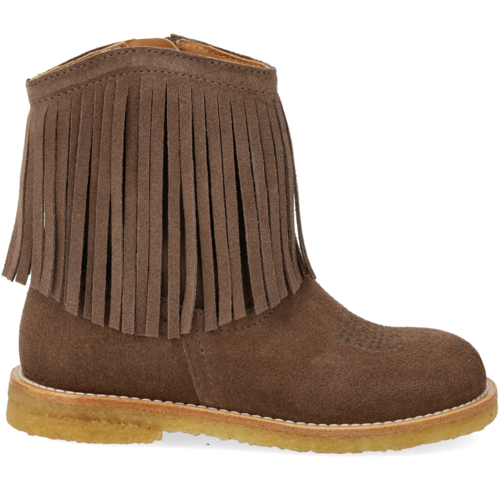Discover the charm of the Angulus Dark Taupe Cowboy Boot, blending impeccable style and comfort for your little one. This enchanting suede boot features delicate fringe detailing and elegant, tone-on-tone western-inspired embroidery that captures the adventurous spirit of the wild west. Expertly crafted with a curved shaft and fixed heel cap, it ensures added stability and support during those playful days.