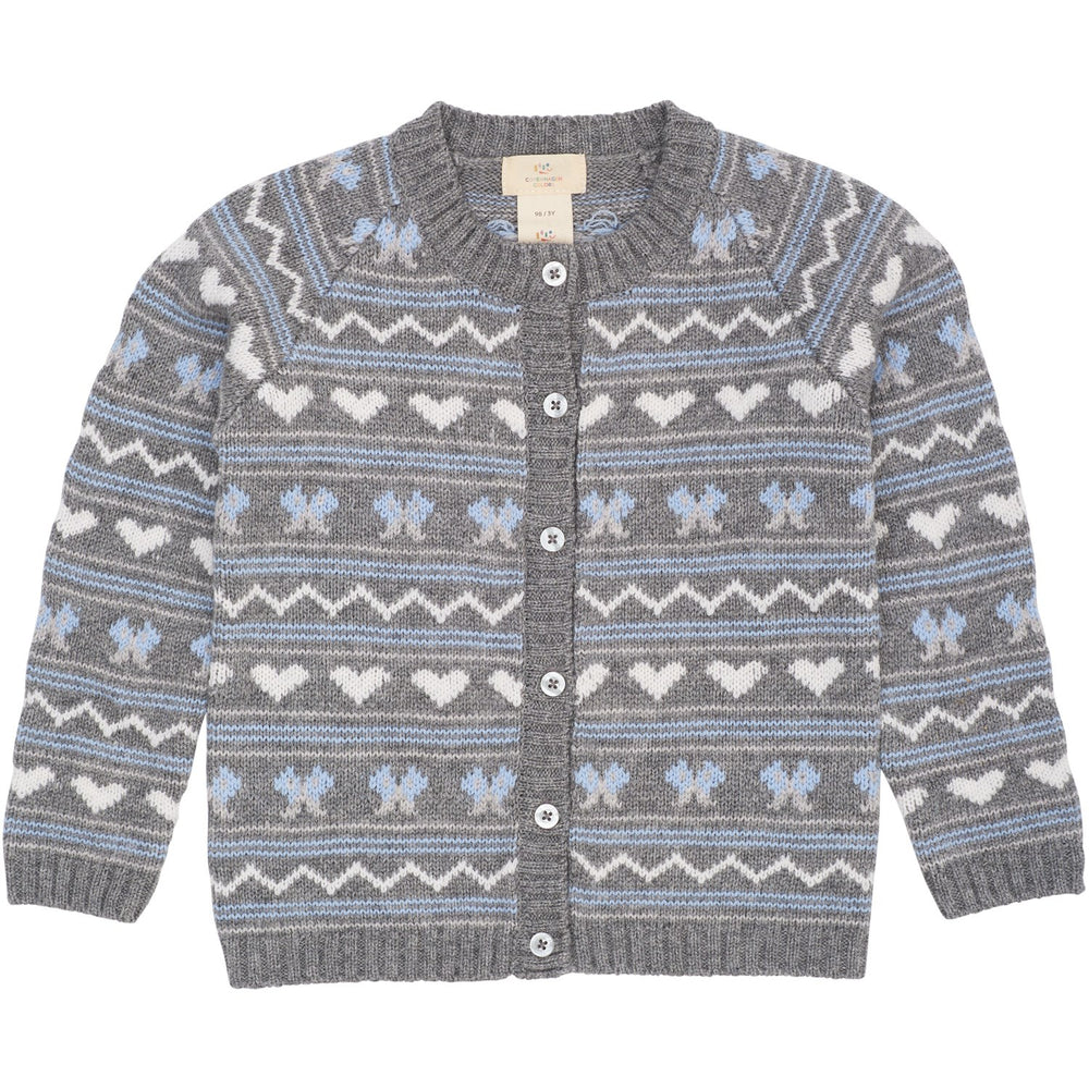 Introducing the cozy and stylish Copenhagen Colors Dk Grey Comb Cashmere Pattern Cardigan, perfect for keeping your little ones warm. Crafted from a luxurious blend of 10% cashmere and 90% wool, this cardigan features a charming knitted pattern on both sides, long sleeves, and a comforting round neck. Its elegant dark grey color and intricate design make it a versatile addition to any child's wardrobe. Easy to care for and designed for maximum comfort and wearability, this cardigan ensures your child stays snug and fashionable in cooler weather. Ideal for both casual and more formal occasions, it’s a must-have for the chilly seasons.