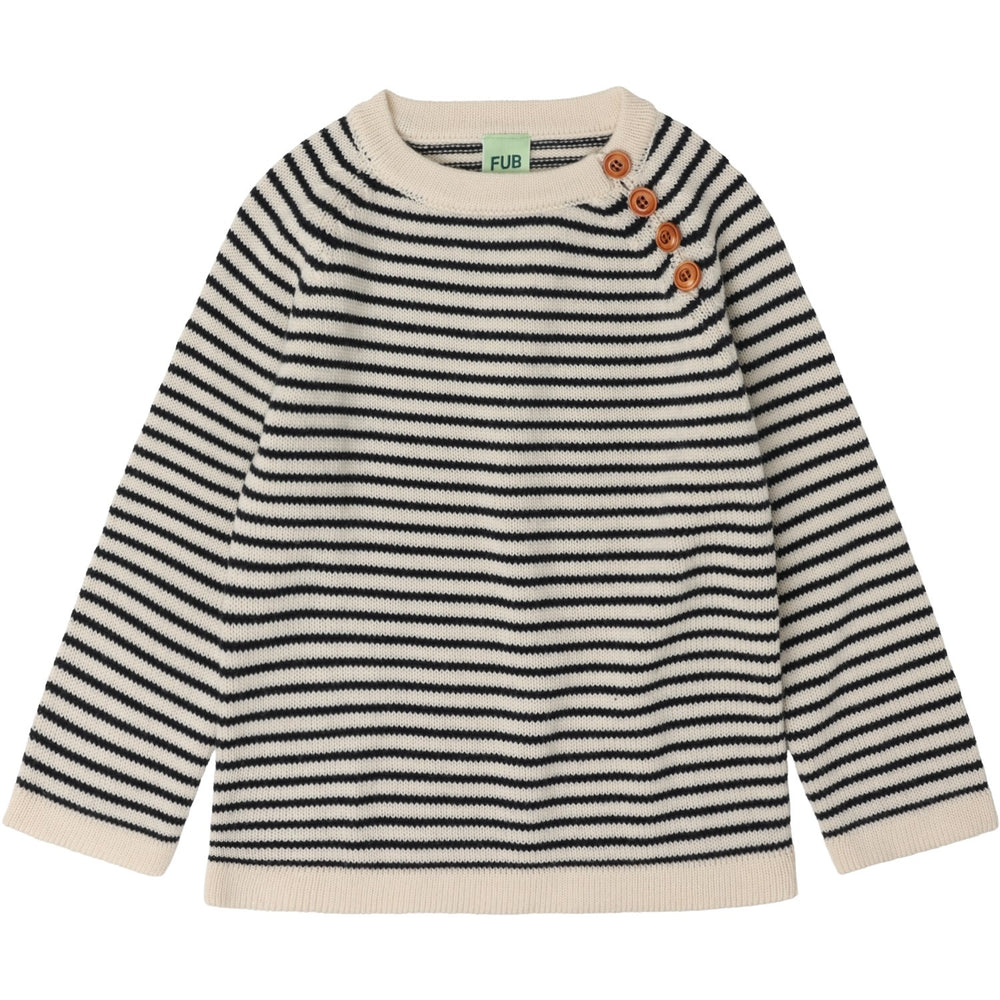Wrap your little one in cozy sophistication with the FUB Ecru/Dark Navy Sweater, a testament to classic style and comfort. Crafted from 100% OEKOTEX®, RWS, and BLUESIGN® certified merino wool, this sweater ensures your child stays warm without the worry of harmful chemicals. Its charming yarn-dyed stripes in ecru and dark navy, coupled with the natural elegance of wooden button closures, provide a timeless appeal.