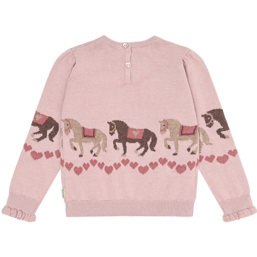 Introducing the delightful Adobe Rose Pani Horse sweater by Hust & Claire, expertly crafted with cozy knitted material to keep your little one warm and fashionable. Featuring a charming horse design in a beautiful adobe rose hue, this sweater combines timeless elegance with playful style. Its snug fit ensures comfort and easy movement, ideal for cheerful play dates or cozy family gatherings. Easy to care for and durable, it promises to be a lasting addition to any child's wardrobe. Perfect for mixing and matching, this sweater enhances any outfit with a touch of whimsy and warmth.