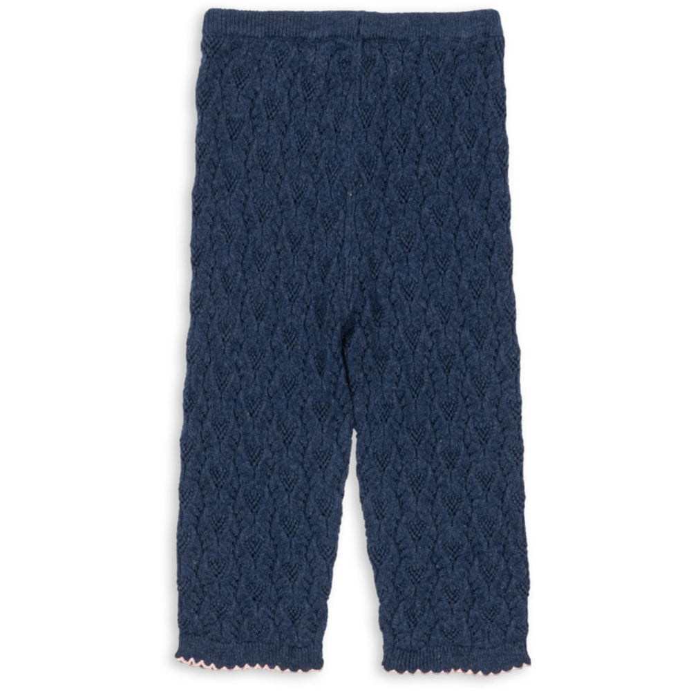 Introducing the Konges Sløjd Ensign Blue Rosier Pants, expertly knitted in a charming rosette knit point adorned with embroidered roses at the hems. Crafted from a luxurious blend of 94% cotton, 3% wool, and 3% cashmere, these pants combine elegance with exceptional softness. The serene ensign blue hues paired with intricate patterning work together to offer a stylish yet comfortable fit, ideal for your little one's active days or cozy moments. Easy to care for, these pants ensure durability alongside warm, breathable wearability, making them a perfect addition to any child's wardrobe. Materials: 94% Cotton, 3% Wool, 3% Cashmere
