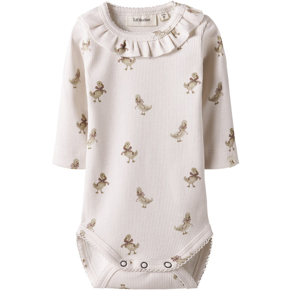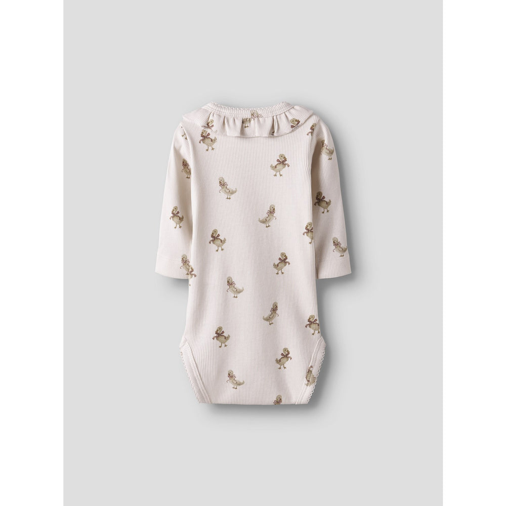 Dress your little one in the Lil'Atelier Almost Mauve Goose Nbflavo Loa Ls Slim Body, designed for comfort and style. This bodysuit features soft, stretchy jersey fabric, ensuring a snug yet flexible fit, with a gently rounded neckline and long sleeves adorned with delicate frills for a touch of charm. The all-over print adds a playful vibe, while the easy-care material offers hassle-free maintenance. Ideal for both daily wear and special occasions, this bodysuit combines functionality with a fashionable flair, keeping your child cozy and cute all day long. Please note: Keep away from fire.