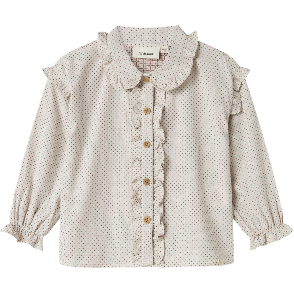 Introducing the Lil'Atelier Pastel Parchment Nmfolena Ls Loose Shirt—a truly classic choice in children's fashion! Crafted from woven fabric with a distinctive criss-cross pattern, this shirt brings a subtle texture and timeless elegance to your child's wardrobe. The design focuses on comfort and style with its loose fit, long sleeves with elasticated cuffs, and a smart shirt collar. Delicate frills add a whimsical touch, making it perfect for any occasion. Easy to care for, this shirt is secured with button fastenings and features a clean, vibrant look that stands out effortlessly. Ideal for both casual outings and more formal gatherings, it ensures your child looks great and feels comfortable throughout the day.