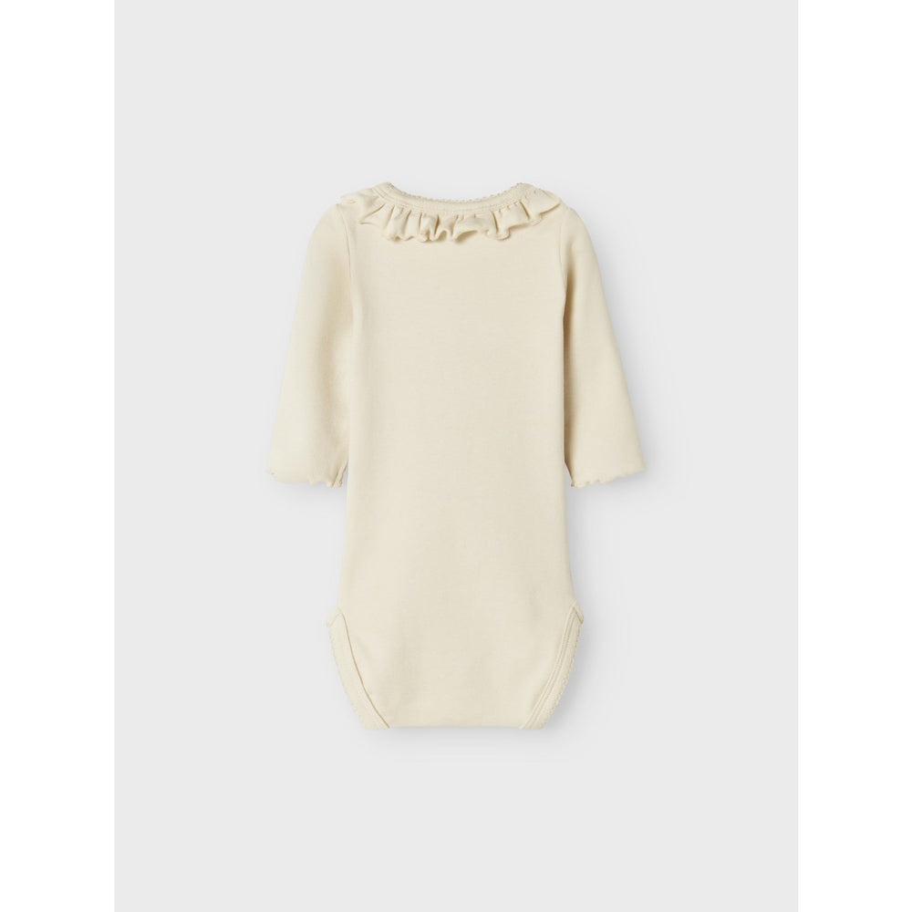 Discover comfort and style for your little one with the Lil'Atelier Turtledove Nbfgayo Koj Ls Slim Body. Crafted from soft, stretchy jersey, this bodysuit ensures maximum comfort and ease of movement for your child. Featuring a charming round neck, long sleeves, and convenient press stud fastenings for easy dressing, it's accented with frilly details and a delicate babylock finish. The trendy, neutral color makes it a versatile addition to your child's wardrobe. Ideal for everyday wear, it combines durability with a touch of elegance, perfect for both rest and play.