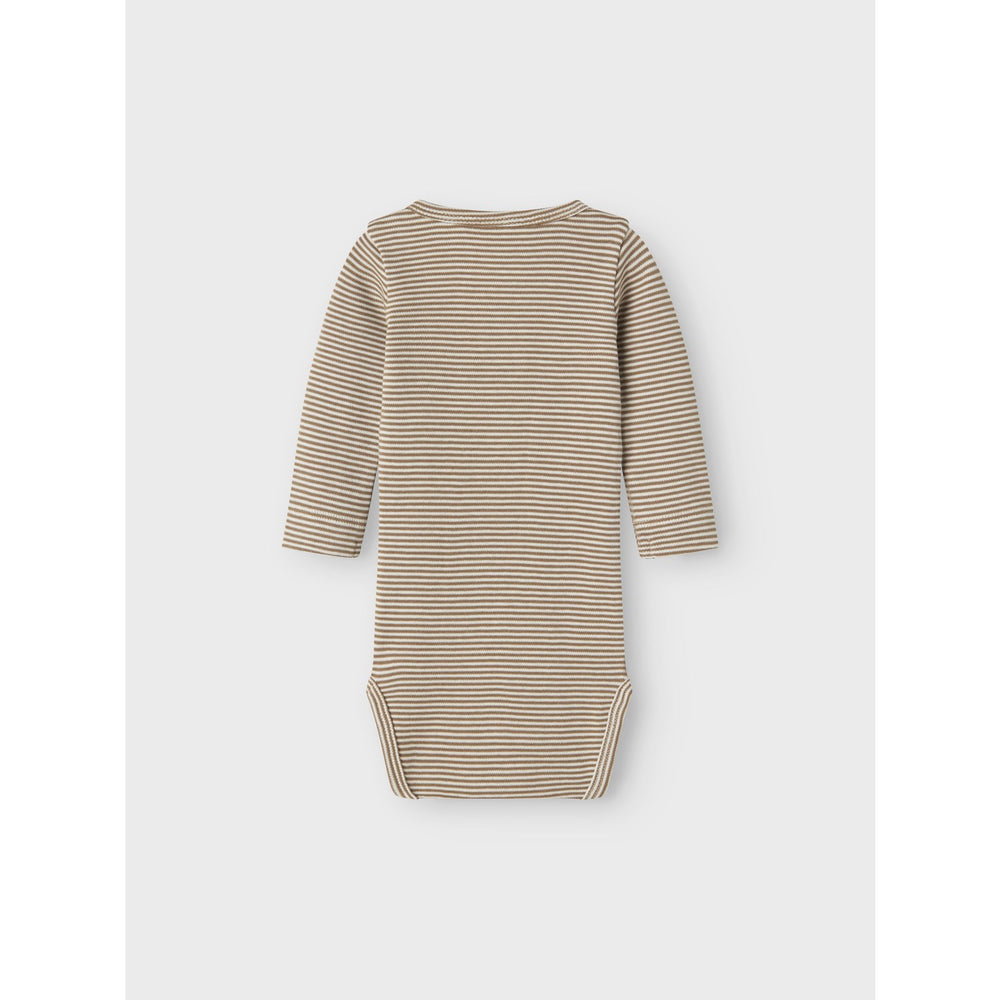 Dress your little one in the charming Lil'Atelier Turtledove Sepia Tint Nbmohio Ls Slim Body. Crafted from soft, child-friendly materials, this bodysuit features a stylish grandad neck and long sleeves perfect for any season. It’s designed in a beautiful sepia tint with a subtle pattern that radiates a trendy vibe. The bodysuit ensures a snug fit, offering comfort and ease of movement for your child. For added convenience, it includes a button and press stud fastening for easy dressing. Care has been taken to add a label for garment details and the reminder to keep it away from fire for safety. This piece blends both fashion and function, making it an ideal addition to your child's wardrobe.
