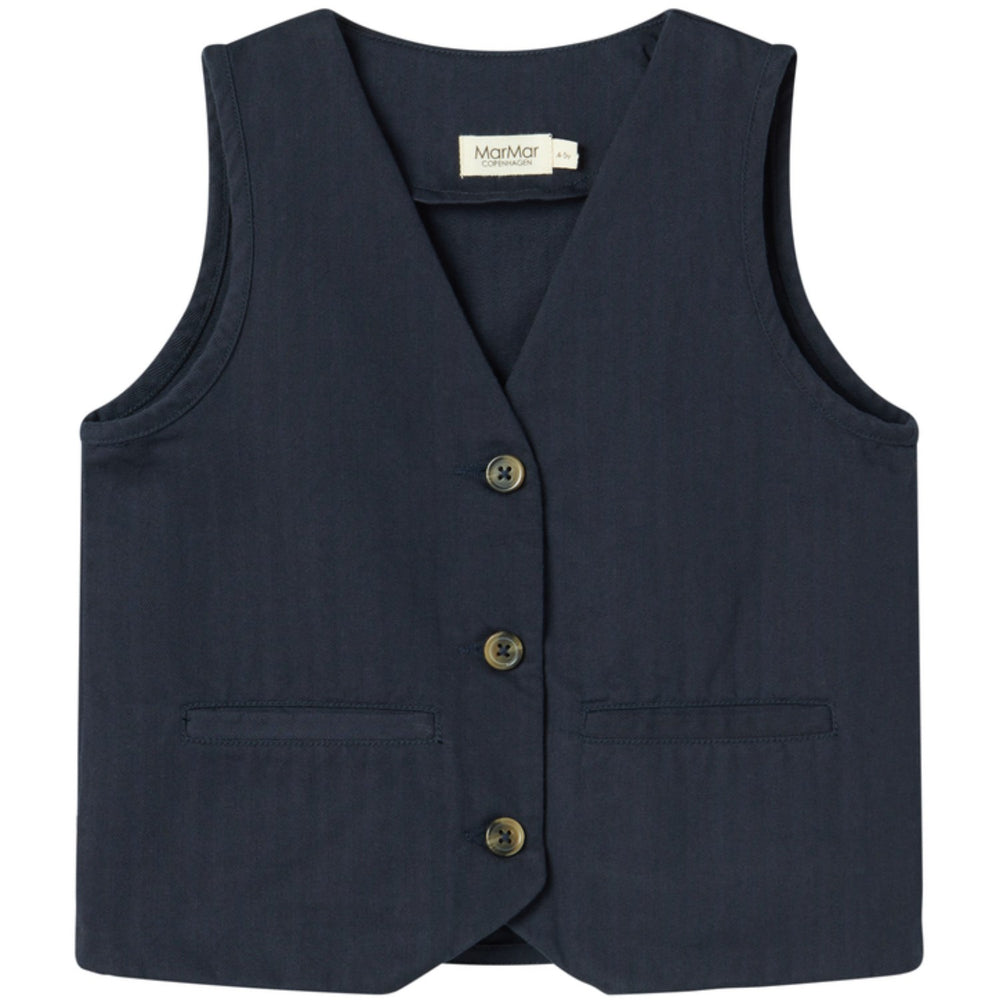 Introducing the MarMar Herringbone Twill Pilot Navy Jason Vest - a blend of style and comfort for your little one. Crafted from 100% cotton twill, this vest is not only cool and classic but also safe as it's Oeko-Tex® certified, free from harmful chemicals. Its versatile navy color easily complements different outfits, making it perfect for both daily wear and special events. The fabric ensures maximum comfort and durability, ideal for children's active lifestyles. Elevate your child's wardrobe with this charming and practical piece! Materials: 100% Cotton Washing instructions: Wash - Machine wash 40°C extra gentle, Bleach - Do not bleach , Drying - Do not tumble dry, Ironing - medium, Dry Clean - Do not dry clean Certifications: BSCI Twill in 100% Cotton Cool and classic Perfect for both everyday wear and special occasions Classic colour that makes mixing and matching easy Oeko-tex® - Tested for harmful chemicals