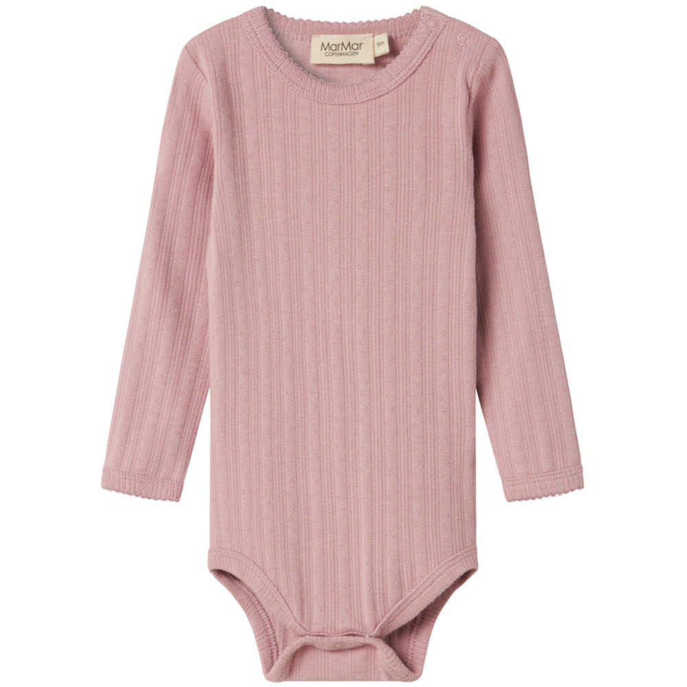 Introducing the MarMar Modal Pointelle Soft Berry Benedicte Body, a must-have for your little one's wardrobe. Crafted from luxurious Modal fabric, this plain long-sleeved bodysuit combines style and functionality. It features a delightful soft berry color and a seamless pointelle pattern that adds a touch of elegance. Designed with practicality in mind, it includes snap buttons on the left shoulder and at the crotch to simplify changing times. The snug fit ensures comfort without restricting movement, making it perfect for all-day wear. Easy to care for and durable, this bodysuit is an ideal blend of comfort, style, and convenience – perfect for playful days or cozy nights. Materials: 47% Modal 48% Cotton (Organic) 5% Elastane Washing instructions: Wash - Machine wash 40°C , Bleach - Do not bleach , Drying - Do not tumble dry, Ironing - medium, Dry Clean - Dry clean possible Pointelle with elastane Picot stitches Fine and delicate design Soft, stretchy and comfortable to wear Oeko-tex® - Tested for harmful chemicals