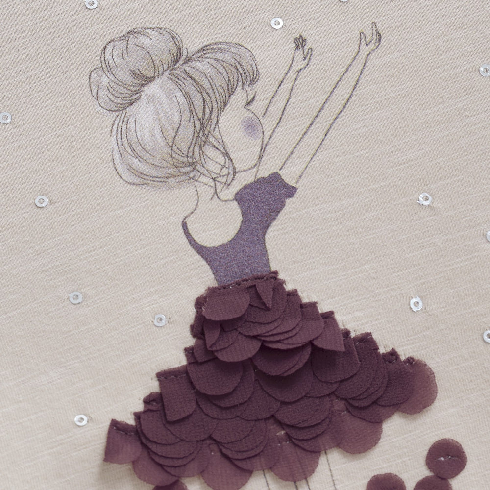 Crafted with care, this long-sleeved Minymo blouse in smoke gray features delicate ruffle details along the shoulders, adding a touch of elegance. Centered with a charming 3D ballerina print adorned with sparkling sequins, it's made from an organic cotton blend that ensures comfort against tender skin. Ideal for both style and ease, this piece blends functionality with a dash of whimsy, perfect for any child's wardrobe.