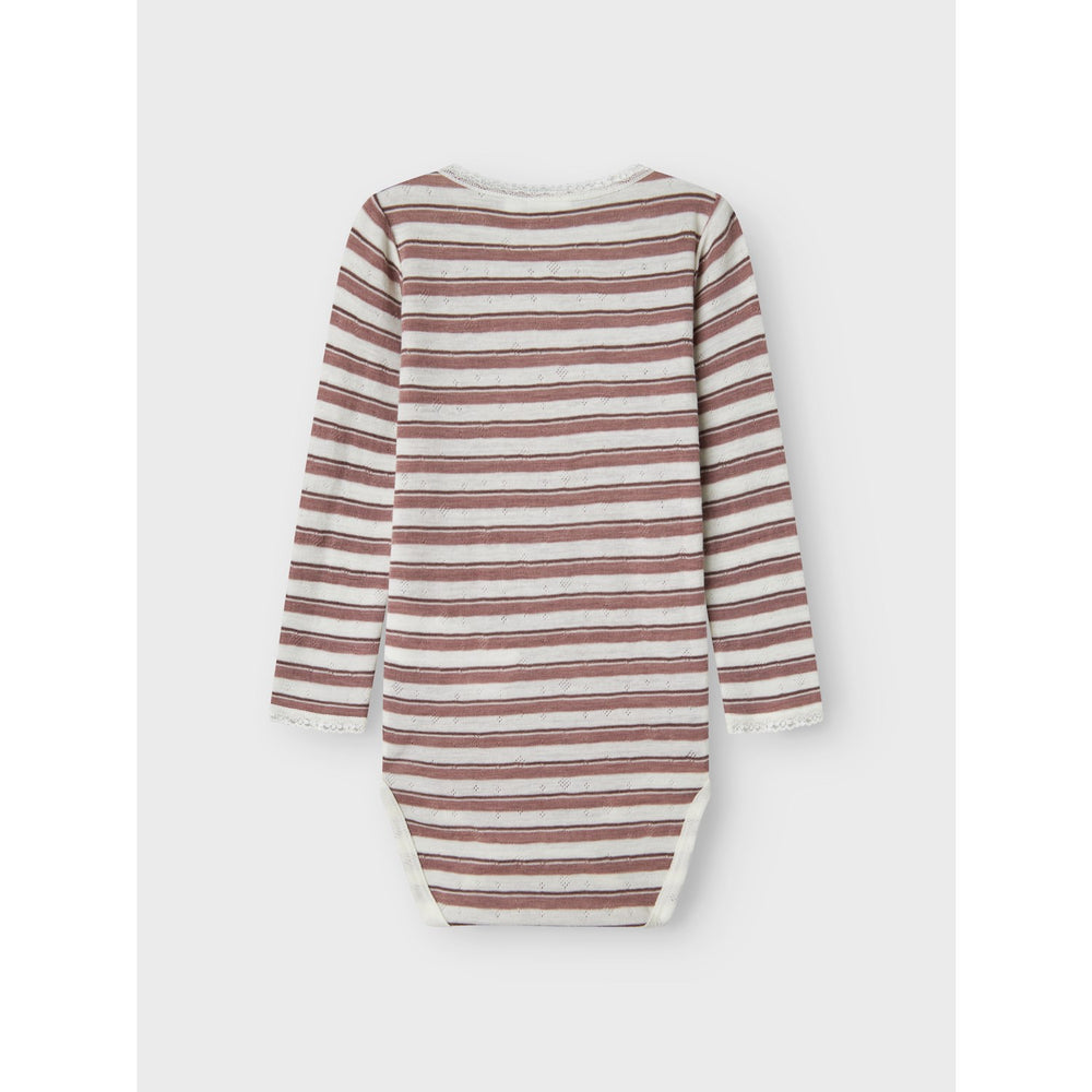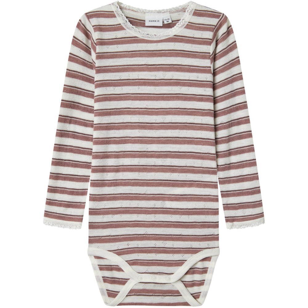 Dress your little one in the charming Name It Antler Snow White Nmfwang Wool Needle Ls Body. This adorable bodysuit features a unique needle drop design with dropped stitches that create distinctive patterns, elevating a simple piece with a touch of cuteness. Crafted for comfort and ease, it comes with a round neck, long sleeves, and convenient press stud fastening in the crotch. Delicate lace details and a playful print that spreads across the whole bodysuit add an extra flair, making it perfect for any occasion. Whether it's playtime or a family gathering, this bodysuit combines style with functionality for all-day wear.