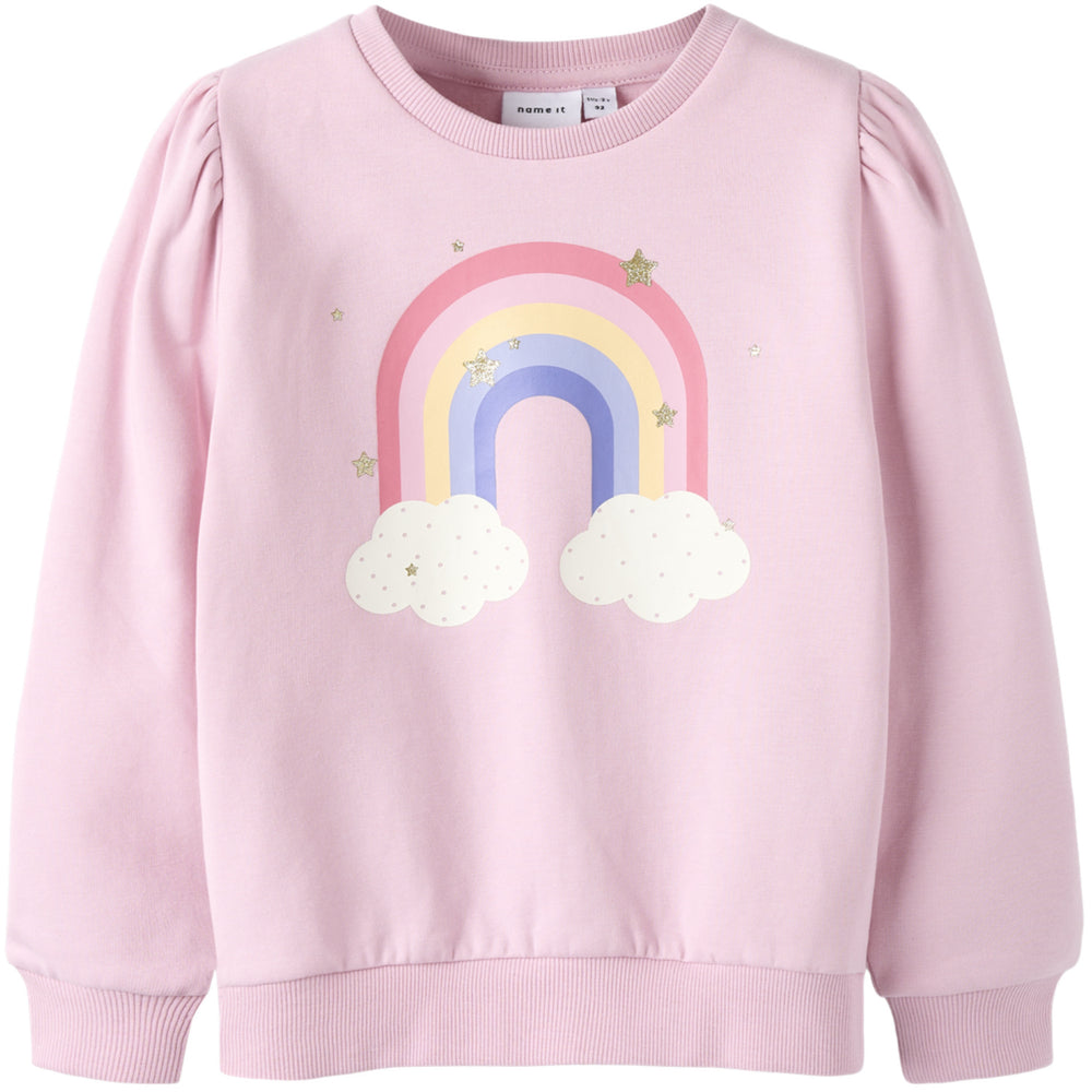 Brighten up your little one's wardrobe with the Name It Cameo Pink Nmflina Ls Swe Bru sweatshirt. This delightful piece features a soft, brushed sweat fabric inside, ensuring cozy wear all day long. With its charming round neck and stylish puff sleeves adorned with glitter details, the sweatshirt combines comfort with trendy design. The pigment print adds a gentle touch to its light fabric, making it both stylish and practical. Perfectly sized with a regular fit, this blend of cotton and elastane offers both stretch and durability. Ideal for everyday play or relaxed weekends, this sweatshirt makes fashion fun! Fit: Regular Materials: 95% Cotton - Organic, 5% Elastane Washing instructions: Maximum Washing Temperature 40°C - Normal Process
