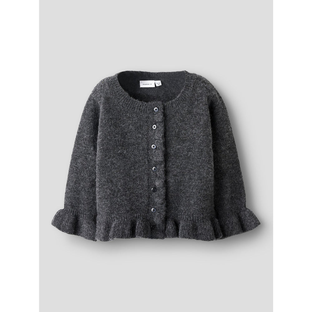 Wrap your little one in warmth with the Name It Dark Grey Melange Nmfsupia Ls Knit Cardigan. Perfect for chilly evenings, this knitted cardigan features a fluffy, hairy knit ensuring supreme softness and a cozy feel. Its regular fit, O-neck design, and long sleeves with ribbed cuffs provide comfort while adding a dash of style with delightful ruffle details. The button fastening makes it easy to wear, turning dressing into a breeze. Crafted with care, this cardigan is ideal for layering over any outfit, offering both functionality and adorable style.