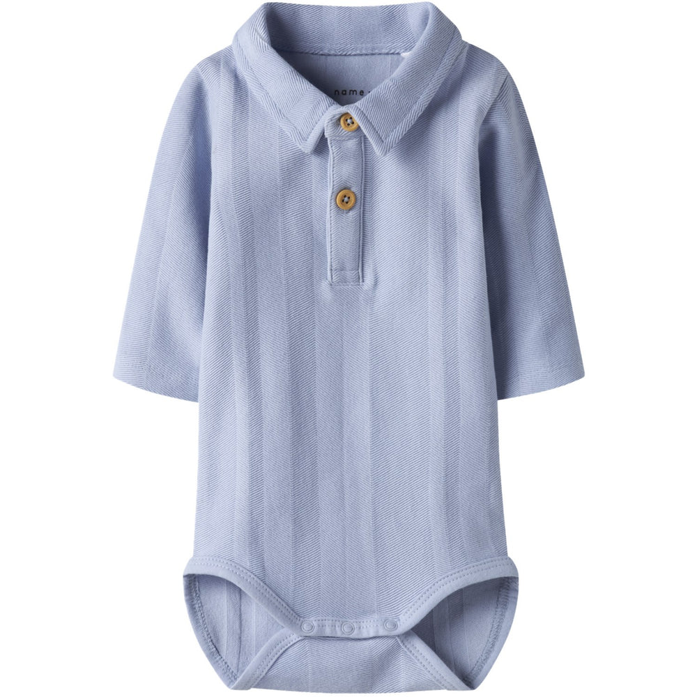 Discover the charm and practicality of the Name It Kentucky Blue Nbmrobo Polo Body. This elegantly designed bodysuit features a jacquard woven pattern, delivering not just style but also a lovely texture that catches the eye. Ideal for year-round comfort, it comes equipped with long sleeves and a classic polo neck, topped with a convenient button fastening. Its soft fabric offers both ease and breathability, ensuring your little one stays comfy all day long. Easy to care for and magnificent in its Kentucky blue hue, this bodysuit is a must-have for enhancing your child’s daily outfits. Note: Keep away from fire to ensure safety and durability. Closure: Button Materials: 100% Cotton - Organic Extra: Preparing for a Circular Future