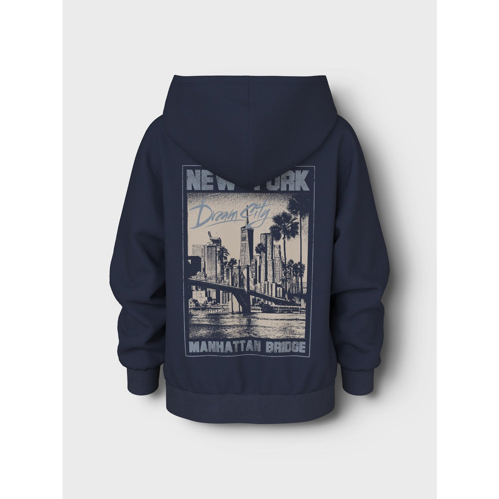 Dress your little one in the Name It Navy Blazer 1986 New York Nkmvoltinus Nreg Sweat Cardigan, where comfort meets style. Crafted with brushed sweat fabric, this cardigan boasts a soft interior ensuring a comfy fit for all-day wear. Featuring a classic round neck, long sleeves, and a secure zip fastening, it has a regular fit that's ideal for growing kids. The rubber print adds a soft touch to the vibrant design, making it a versatile addition for both school days and weekend outings. Easy to care for and durable, this sweater is a must-have in your child's closet.
