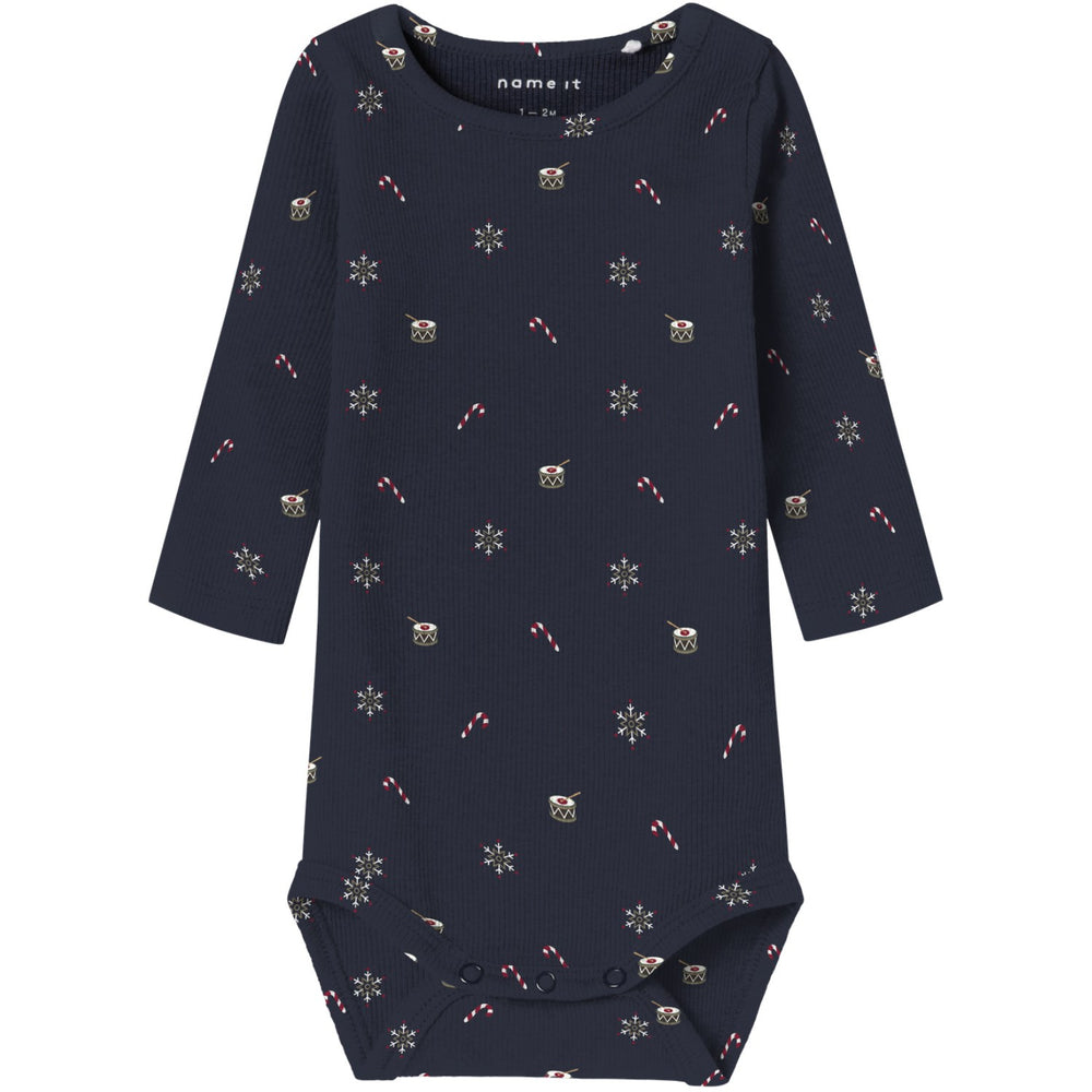Brighten up your little one's wardrobe with the Name It Navy Blazer Nbnroko M Body Box, perfect for celebrating the festive season. This delightful bodysuit features a charming Christmas-themed print that spreads joy and happiness wherever your child goes. Crafted from rib knit with excellent elasticity, it promises both comfort and a classic look with its vertical, striped pattern. Designed with a round neck and long sleeves for added warmth, it also includes convenient press stud fastening for easy dressing. Note: Keep away from fire. Closure: Press Stud Materials: 57% Organic Cotton, 38% Modal, 5% Elastane Extra: The main material in this product contains a minimum of 50% organic cotton. Organic cotton is grown without the use of harmful chemicals. Organic cotton farming protects natural resources and biodiversity.
