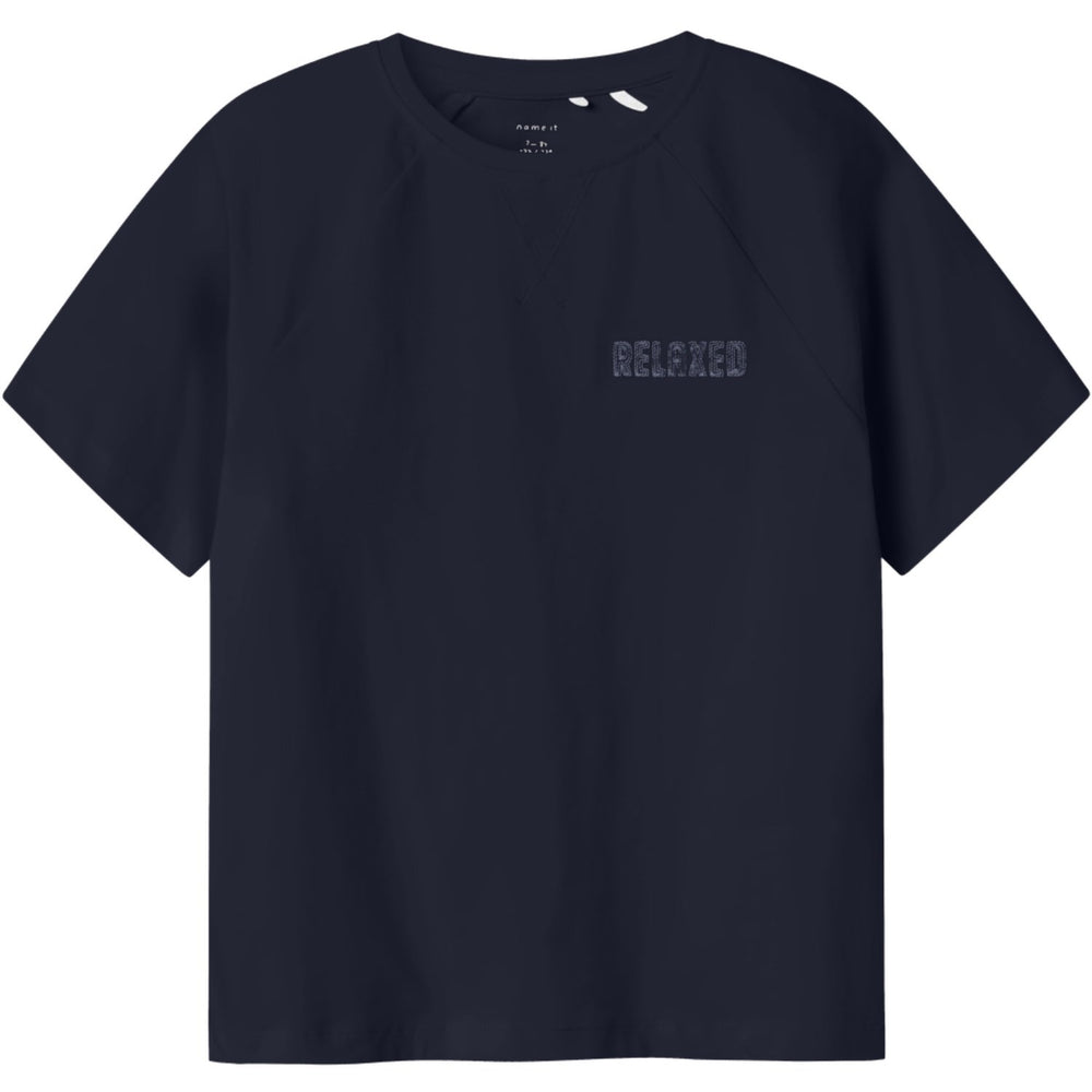 Brighten your child's wardrobe with the Name It Navy Blazer Nkmrob Nreg Ss Top. Crafted from heavy jersey for a comforting drape and clean aesthetic, this navy blue T-shirt features a classic round neck and short sleeves, accentuated with subtle embroidery details. Designed for everyday wear, it boasts a regular fit that provides ample room for movement, ensuring your child stays comfortable throughout the day. The versatile styling options of this T-shirt make it perfect for pairing with various bottoms, facilitating a stylish yet practical ensemble for any casual setting. Easy to care for and durable, it's an excellent choice for your child's playtime and adventures.