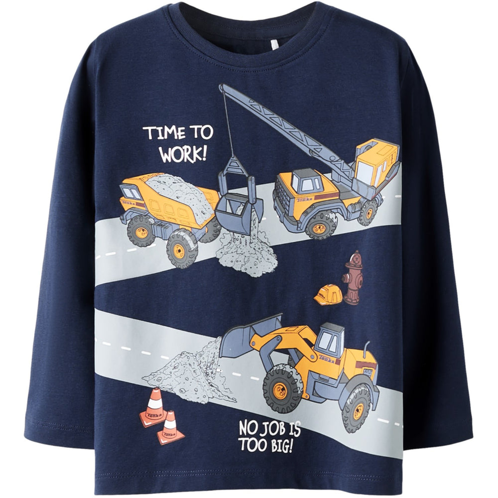 Introducing the Name It Navy Blazer Nmmofek Tonka LS Nreg Top: ideal for enhancing your child's wardrobe with its cool, versatile design. This top is crafted from soft, lightweight jersey fabric that ensures comfort and mobility. Its classic round neck and long sleeves make it suitable for both everyday activities and special occasions. The distinctive rubber print adds a touch of fun without sacrificing feel, ensuring it's both appealing and gentle on your child's skin. This top comes in a regular fit, providing ample freedom of movement. Easy to care for and fire-safe, it's a practical and stylish addition to any young wardrobe.