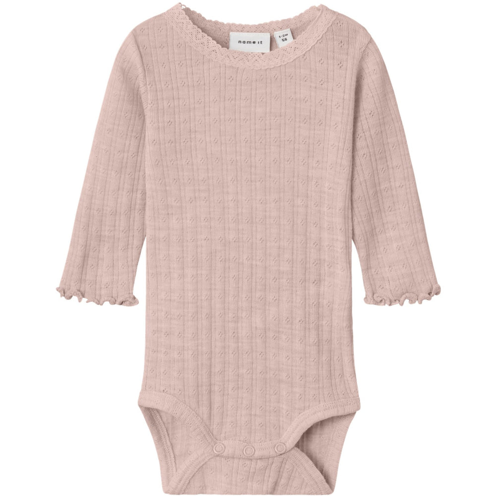 Dress your little one in the comfort and classic style of the Name It Shadow Gray Nbfwossa Wo/Si Rib Ls Body. This soft wool bodysuit is perfect for ensuring year-round comfort and features a rib-knit design with vertical stripes that stretch for a snug fit. With convenient press stud fastenings in the crotch and a cozy round neck paired with long sleeves, this bodysuit mixes practicality with timeless fashion. Ideal for daily wear or special occasions, it offers both durability and easy care, making it a staple in any child's wardrobe.