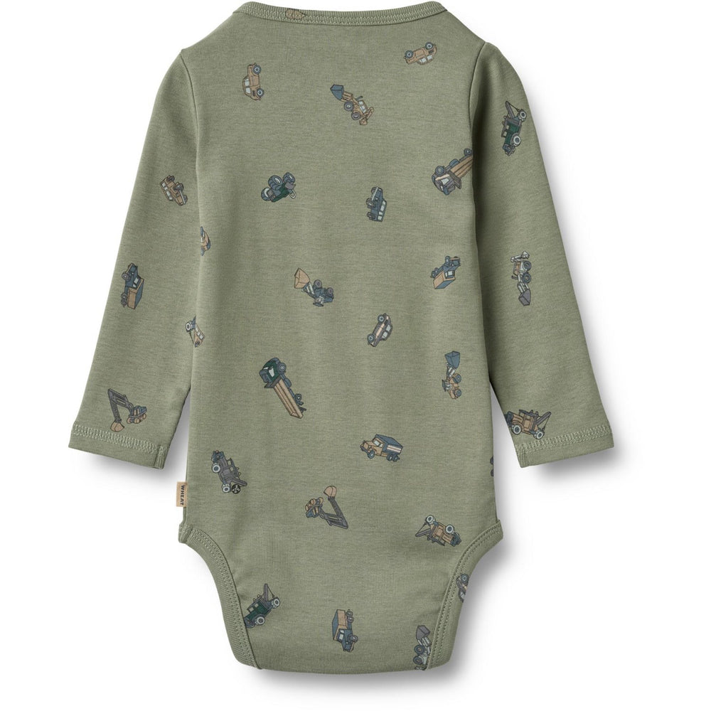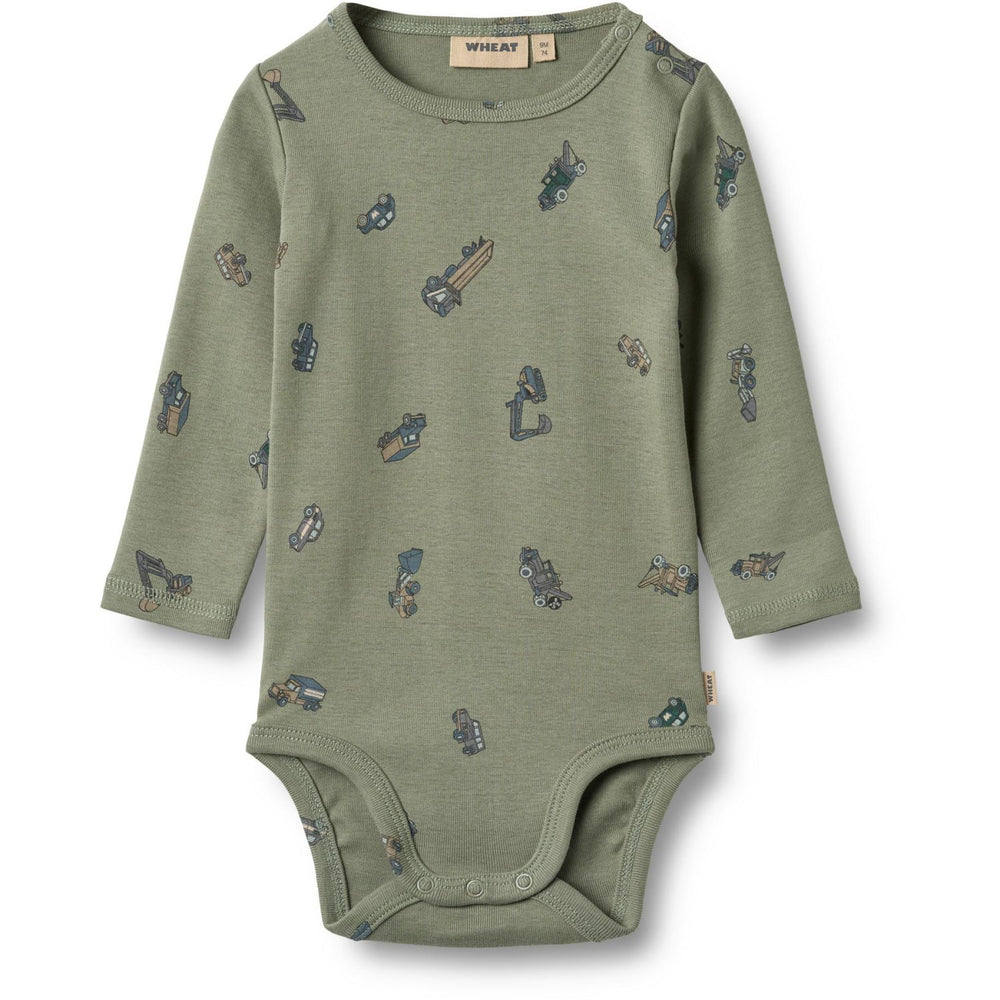 Dress your little one in the comfort and charm of Wheat's Dusty Green Cars Body L/S Freddie, a delightful choice for both baby boys and girls. Made from 100% organic cotton, this long-sleeved bodysuit promises a soft touch on delicate skin, adhering to the highest standards with its GOTS certification and OEKO-TEX® Standard 100 approval. Designed for ease, it features practical press buttons at the left shoulder and crotch for hassle-free dressing and quick diaper changes.