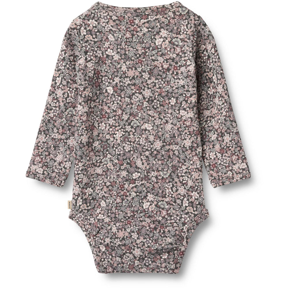 Discover the charming Wheat Purple Stone Flowers Body L/S Liv, perfect for infusing a touch of whimsy into your little one's wardrobe. Crafted from 95% organic cotton and 5% elastane, this bodysuit promises both comfort and durability, making it ideal for delicate baby skin. It features a delightful hand-drawn all-over floral pattern, adding a unique and playful aesthetic.