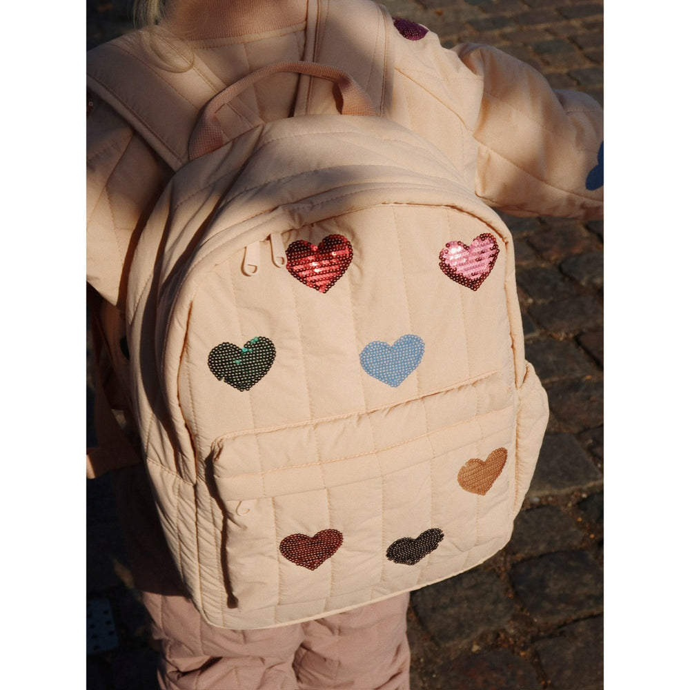 Introducing the Konges Sløjd Cameo Rose Juno Quilted Sequin Backpack Midi: a child's perfect companion! This soft, lightweight backpack features a quilted design and comes equipped with a handy side pocket for bottles and a small zippered front pocket for smaller essentials. The practical chest strap adjusts weight distribution and offers extra support, ensuring your little one's comfort and ease during use. Ideal for both daily adventures and school use, this backpack not only looks great but also keeps everything organized and within easy reach. Materials: 100% Nylon, Lining: 100% Polyester, Padding: 100% Polyester Certifications: OEKO-TEX® STANDARD 100 CLASS 1