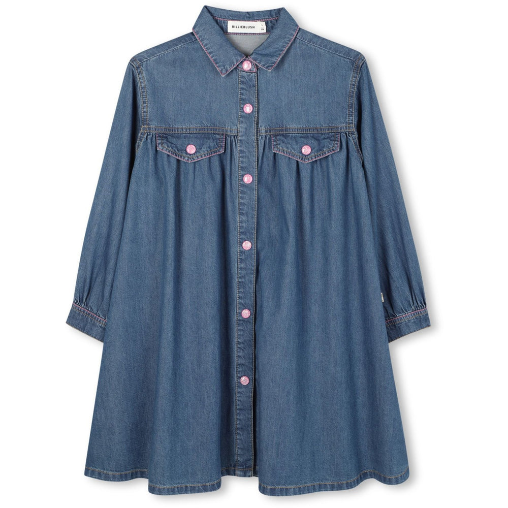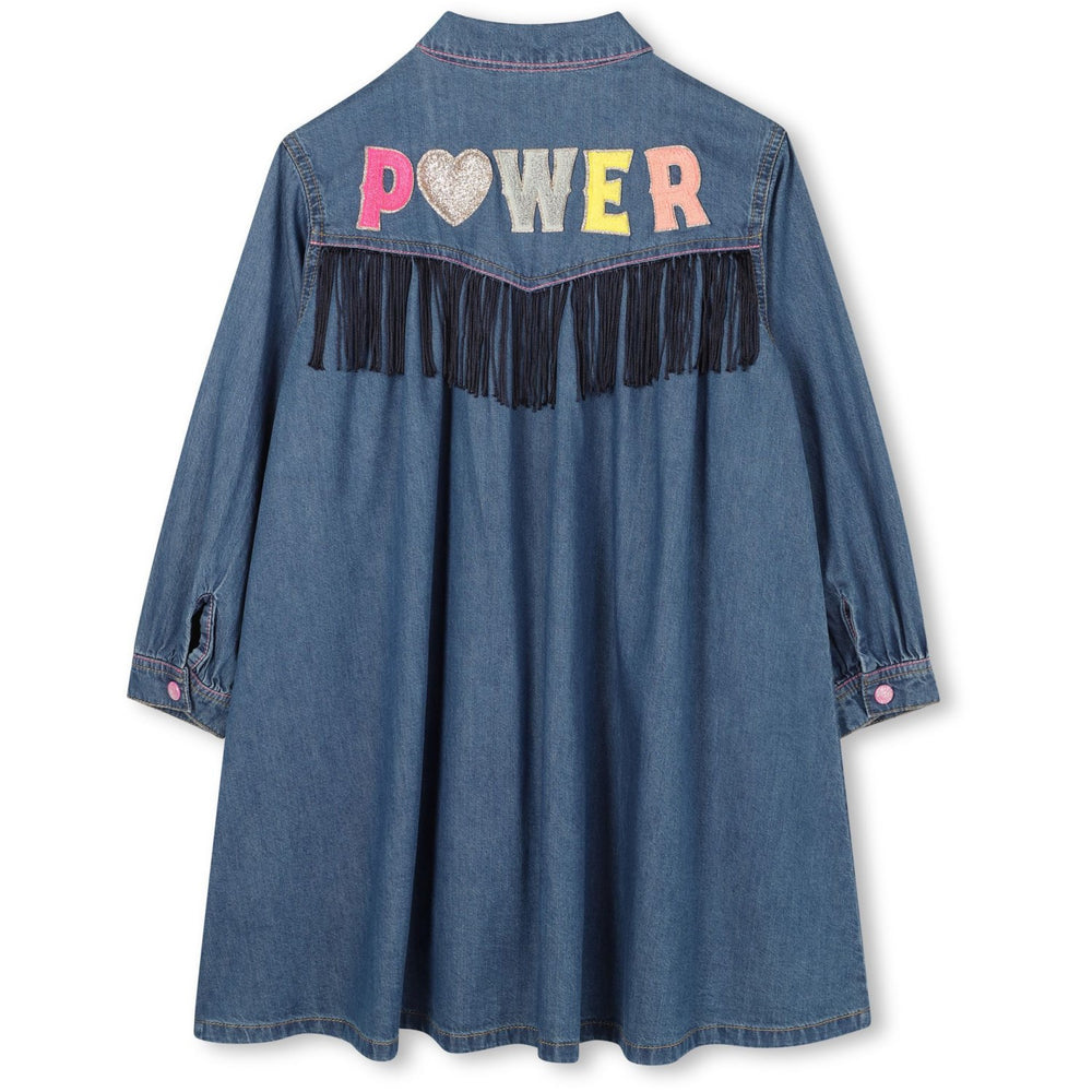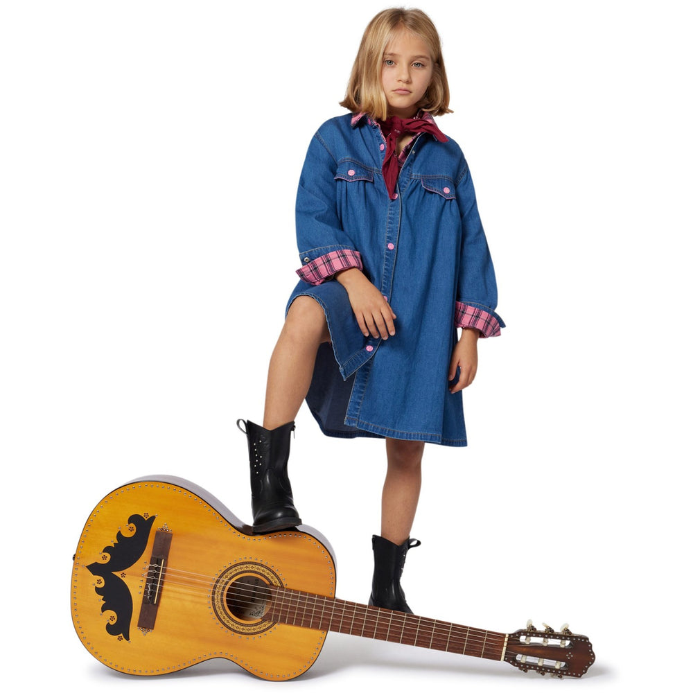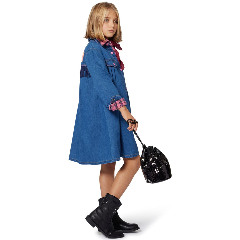 This fun and funky Billieblush denim dress is perfect for your child's wardrobe! The dress has long sleeves and a smart shirt collar, and closes easily with press studs at the front. On the back of the dress, there is a playful illustration with fringes that adds a touch of charm. Comfortable and stylish, this dress is ideal for both play and special occasions.
