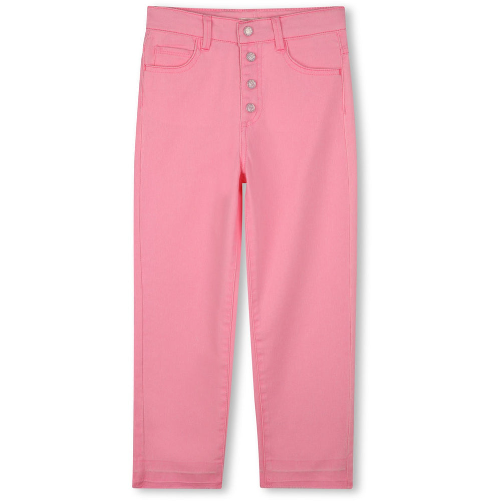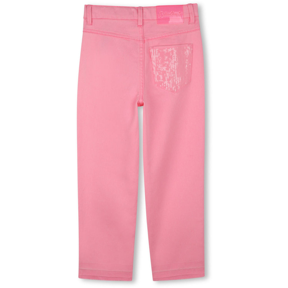 Add colour to your everyday life with these pink denim trousers from Billieblush! The trousers are equipped with three practical front pockets and a sparkling sequin back pocket that adds a little extra glamour to your child's outfit. With an adjustable waist and easy button closure, they are both comfortable and easy to put on for little fingers. A sleek silicone flag patch on the back completes the stylish look. Perfect for the fashion-conscious little trendsetter!