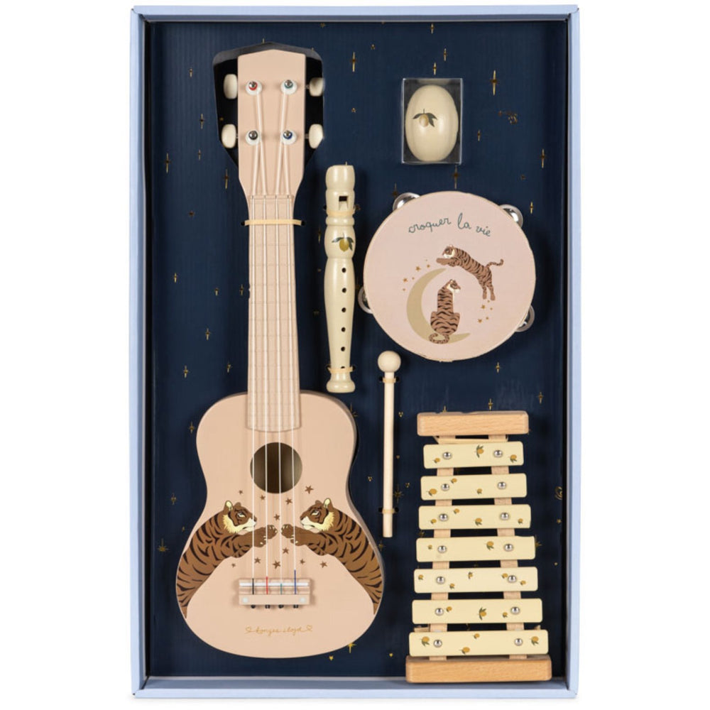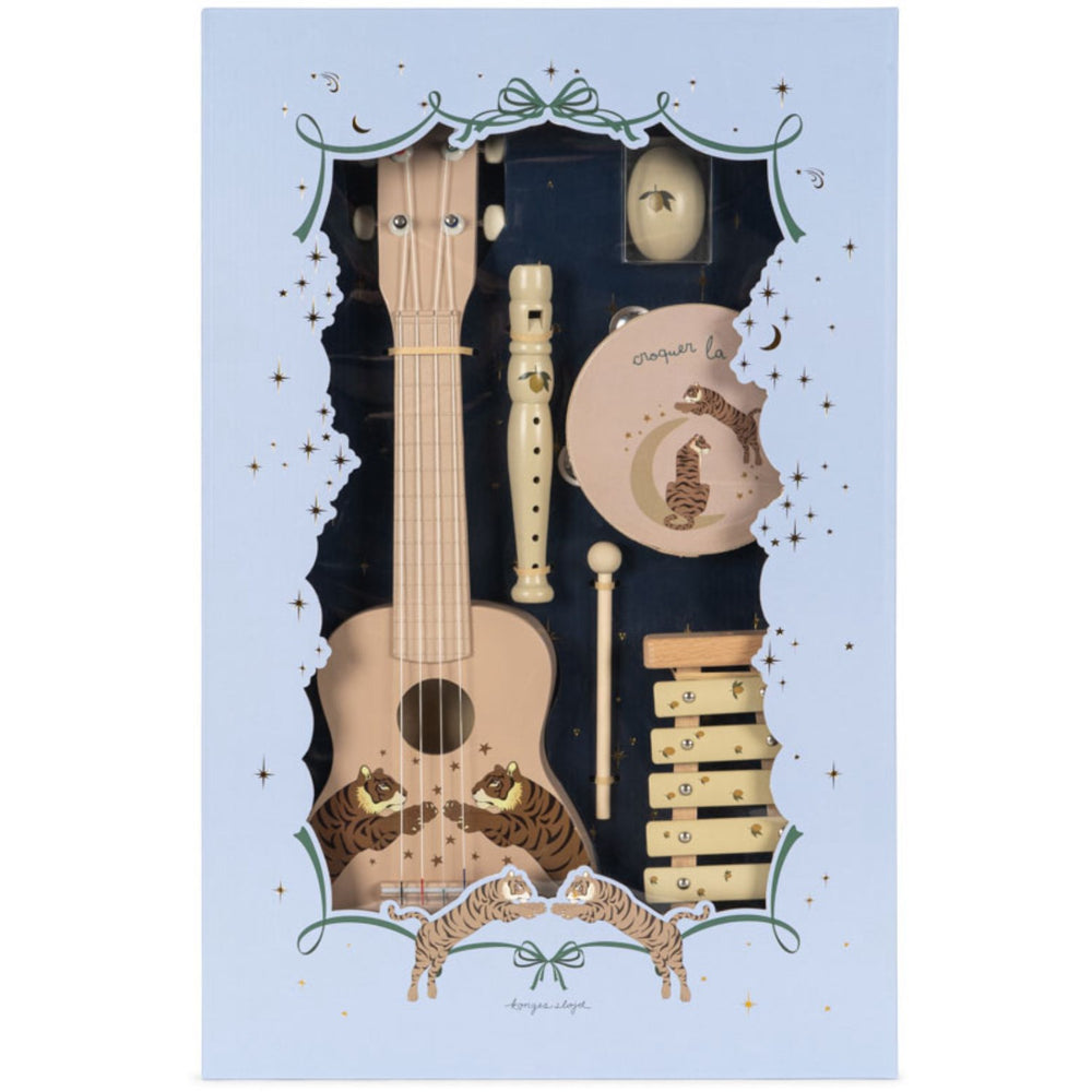 Delight your budding musician with the Konges Sløjd Tiger Sand "All I Wish For" music set. Crafted from FSC™-certified beech and plywood, this ensemble promises not only fun but also safety and sustainability. Ideal for children aged three years and older, it features a charming array of instruments, including a ukulele, xylophone, tambourine, flute, and rattle egg, all nested in a beautiful decorative gift box.