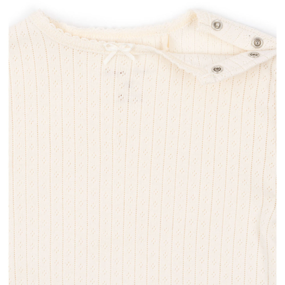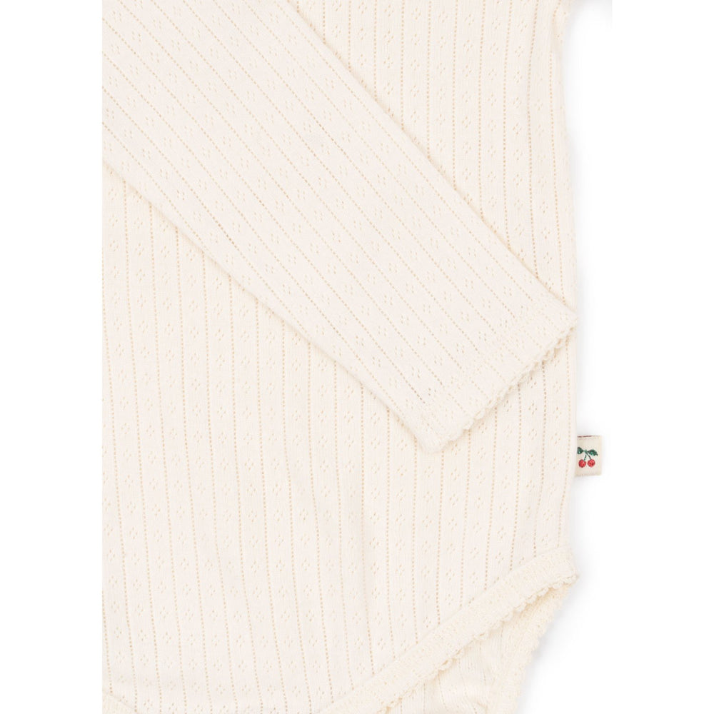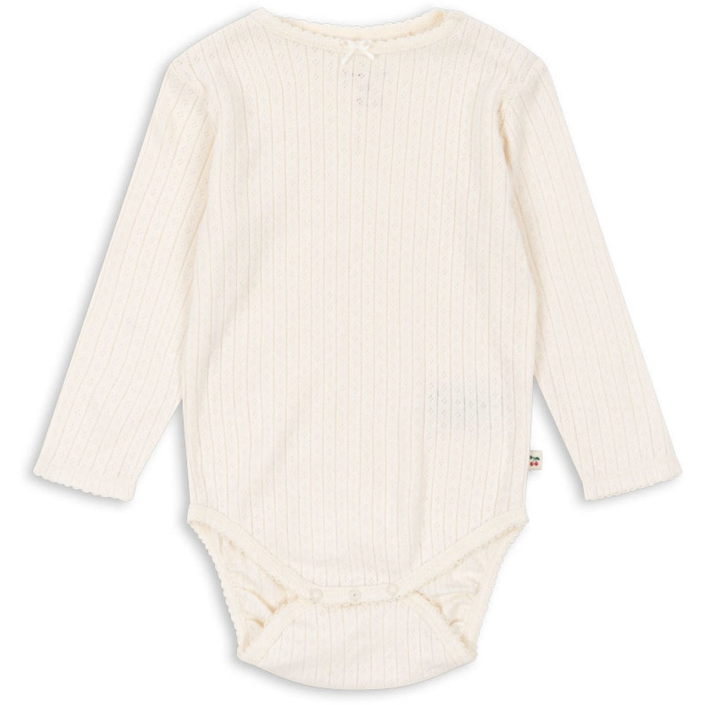 Introducing the Konges Sløjd Antique White Minnie Body - the epitome of comfort and style for your little one. Crafted with 100% GOTS-certified organic cotton, this bodysuit features a charming pointelle design and is equipped with practical snap buttons at the crotch for effortless dressing. Its soothing antique white hue and snug fit ensure it's both a stylish and cozy addition to any child's wardrobe. Ideal as a base layer or a standalone piece, this body suit represents an essential choice for parents prioritizing quality and sustainability.
