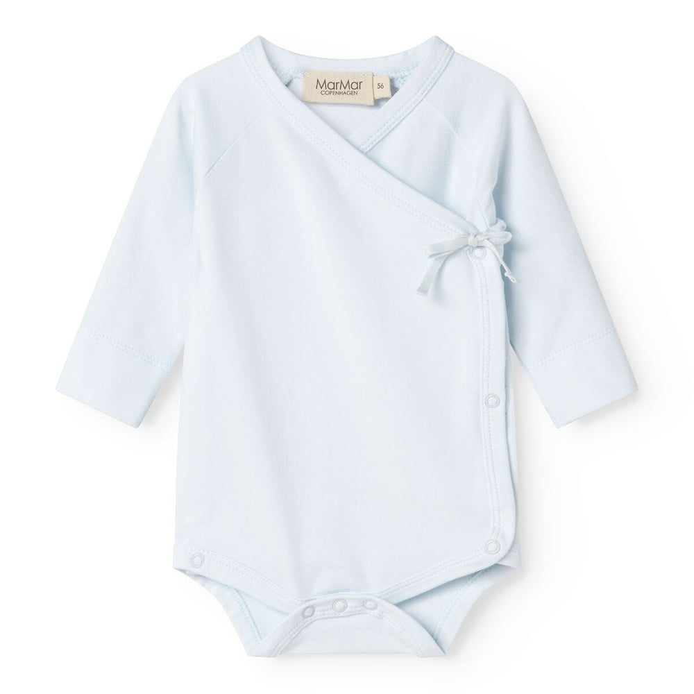 Introducing the MarMar Modal Newborn Light Blue Belita Body, a must-have for your baby's wardrobe! Crafted with care from soft modal fabric, this long-sleeved wrap bodysuit shines in a soothing light blue hue, adorned with subtle patterns. Its innovative design features a practical combination of snap buttons and ribbons for hassle-free changing. Not only does this ensure easy on-and-off, but it also provides a snug and comfortable fit for your newborn. Easy to care for, this piece promises both style and comfort for your little one's daily adventures. Perfect for everyday wear, the Belita Body from MarMar blends functionality with elegance, keeping your baby cozy and stylish. Materials: 47% Modal, 48% Cotton (Organic), 5% Elastane Washing instructions: Wash - Machine wash 40°C , Bleach - Do not bleach , Drying - Do not tumble dry, Ironing - medium, Dry Clean - Dry clean possible Extra: Jersey with elastane, Soft, stretchy and comfortable to wear, High quality that keeps shape and color, Wear it with everything, Oeko-tex® - Tested for harmful chemicals, Modal styles is a favorit since 2008 and is lanched in new colors each season