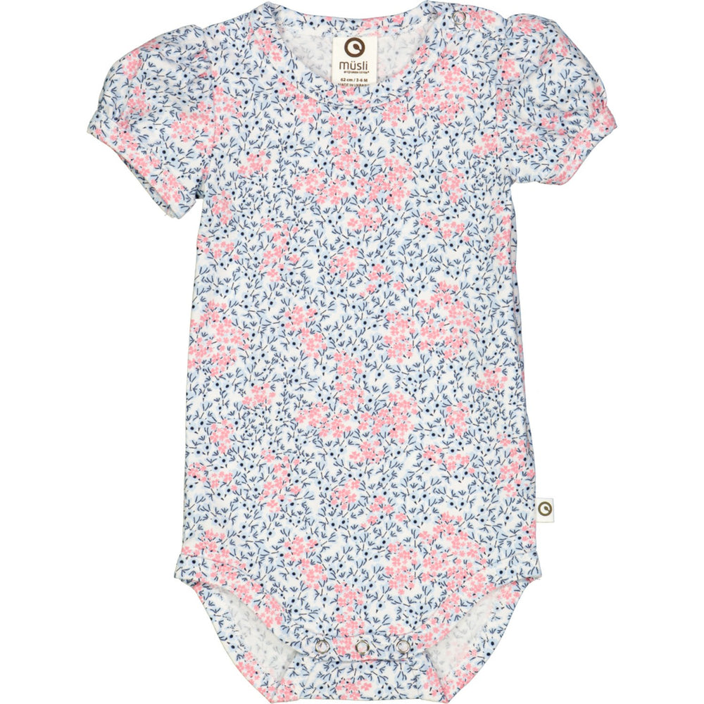 Dress your little one in the delightful Müsli Balsam Cream/Bubblegum/Night Blue Petit Puff Body, perfect for keeping them comfortable and stylish. This charming short-sleeved bodysuit features a vibrant all-over floral print and adorable puff sleeves that add a touch of femininity. Crafted from soft and stretchy single jersey, consisting of 95% organic cotton and 5% elastane, it ensures a snug and flexible fit. The body suit is easy to wear, with openings at the neck and bottom for convenient dressing. GOTS Organic certified by Ecocert, it guarantees not only the use of organic cotton but also eco-friendly production processes and fair working conditions. Ideal for daily wear, this bodysuit combines functionality with cute style, making it a must-have in your child's wardrobe.