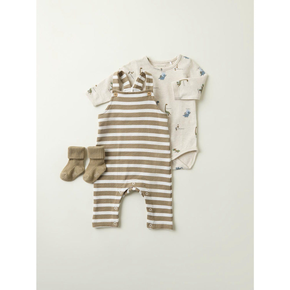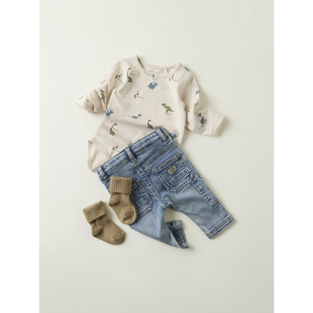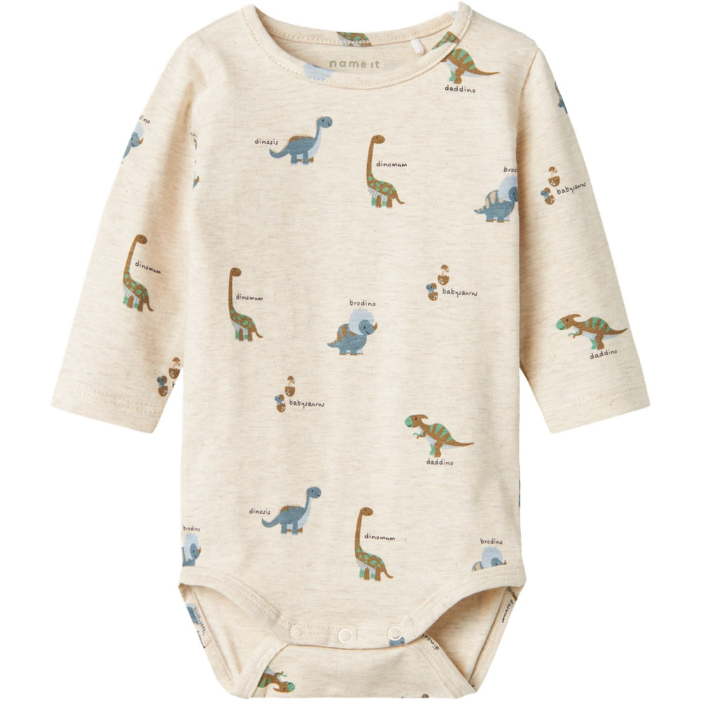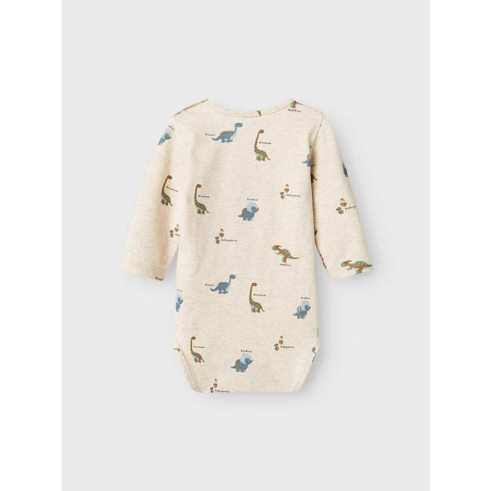 Introduce a touch of prehistoric fun to your little one's collection with the Name It Peyote Melange Dinos Body. This charming bodysuit features a delightful dinosaur print spread across its entirety, crafted from soft, stretchy jersey material to ensure your child's utmost comfort and mobility. Tailored with long sleeves and a classic round neck, it guarantees ease of movement and fuss-free dressing with its press stud fastening. Ideal for year-round versatility and easy care, this bodysuit warns to keep away from fire for added safety.