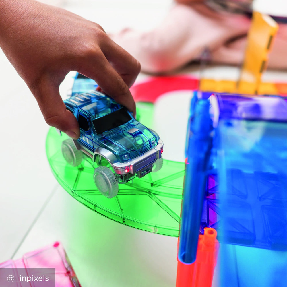 Crafted for safety and durability, the Cleverclixx Blue Race Track Car is made with robust materials suited to withstand frequent use, promising long-lasting fun and learning. Its magnetic design ensures it stays securely on the track, enhancing both safety and engagement. This toy is specifically tailored for use with the Cleverclixx Race Track, ensuring perfect compatibility and ease of use.
