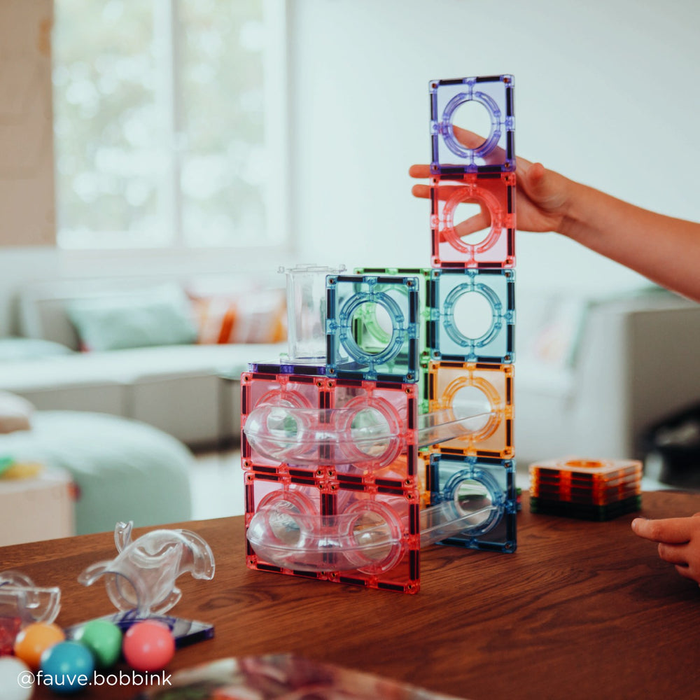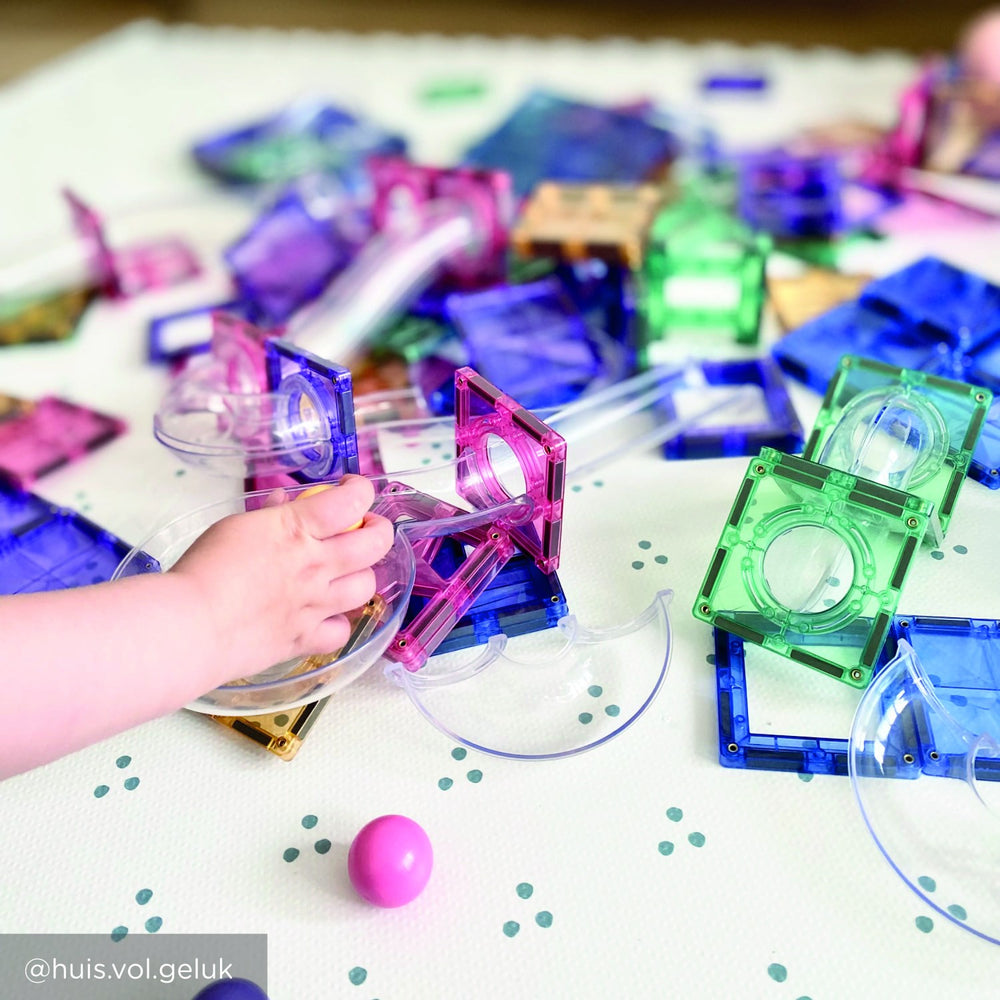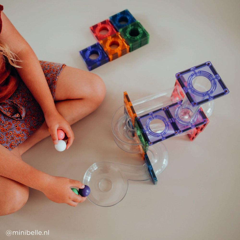 The magnetic toys are crafted from durable materials, built to withstand numerous play sessions. Lightweight and easy to assemble, this set is also simple to store and maintain, making it an ideal addition to any playroom. Expandable with other compatible Cleverclixx sets, it provides a fun and beneficial way for children to learn and explore as they play, fostering creativity and cognitive development in kids from a young age. Step into a world of colorful imagination and inventive play with the Cleverclixx Pastel Ball Run!