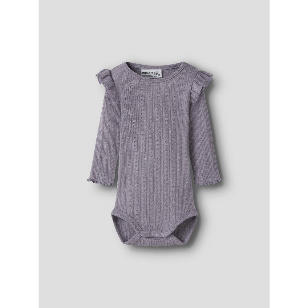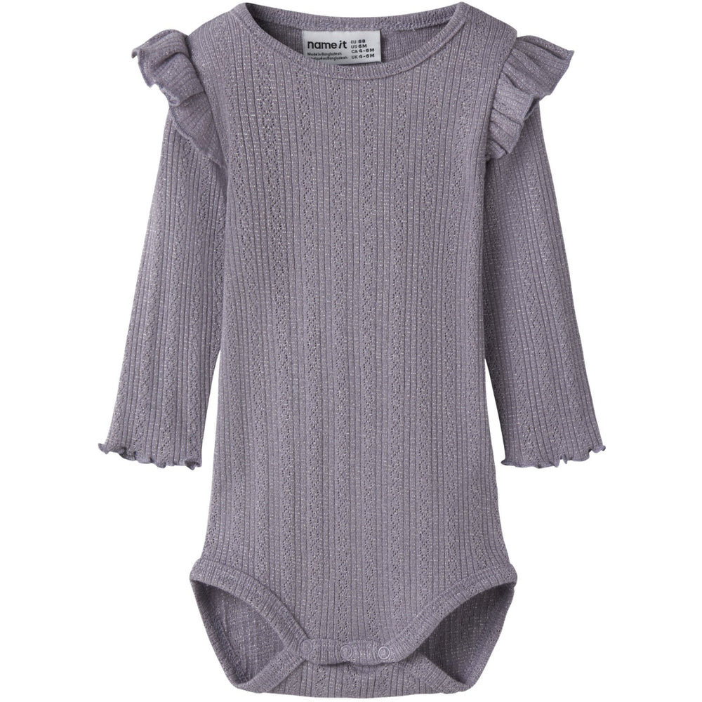 Introduce the cozy charm of our Name It Lavender Gray Melange Nbfblitta Ls Body into your little one’s collection. Fashioned from supple rib knit featuring a classic vertical stripe pattern, this bodysuit combines timeless style with snug comfort. Its round neck and long sleeves provide ample coverage while the press stud fastenings at the crotch and shoulder ensure effortless dressing. Adorned with delightful frills for an extra touch of cuteness, this piece is essential for all-season wear. Please note: Keep away from fire. Materials: 76% Cotton - Organic, 16% Polyester, 8% Metallic Fibres Warning: WARNING! Keep away from fire