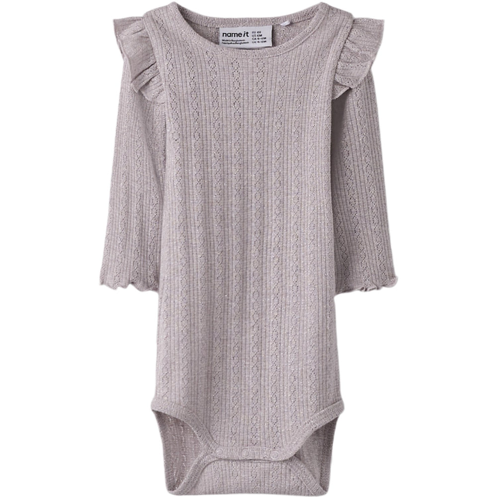 Discover the comfort and charm of our Name It Lilac Marble Melange Nbfblitta Ls Body, a bodysuit designed with your little one's needs in mind. Crafted from a cozy rib knit material featuring a vertical, striped pattern, this bodysuit ensures flexibility and a snug fit with exceptional softness. The adorable lilac marble color paired with delicate frill details adds a whimsical touch. It is equipped with convenient press stud fastenings at the shoulder and crotch for easy dressing. Long sleeves provide extra warmth, making it ideal for any season. Always remember to keep this garment away from fire for your child’s safety. Materials: 76% Cotton - Organic, 16% Polyester, 8% Metallic Fibres Warning: WARNING! Keep away from fire