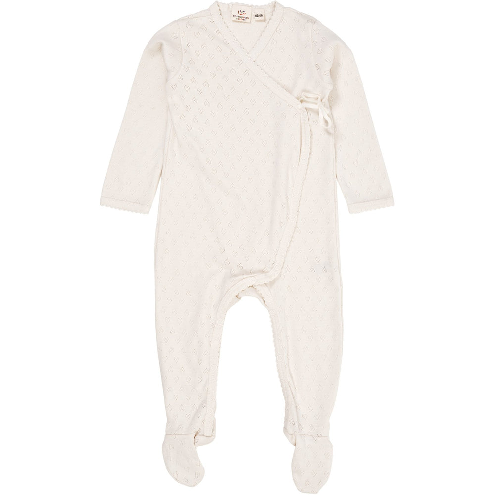Discover the perfect blend of comfort and style with the Copenhagen Colors Cream Pointelle Cross-Over Full Body onesie. Crafted from 100% GOTS-certified organic cotton, this onesie is gentle on your child's skin while being environmentally friendly. Its delightful cream color and charming pointelle pattern featuring small hearts make it a stylish choice. The unique cross-over front opening ensures easy changing, which is a lifesaver for parents. Designed to maintain its shape and resist lint and color fading even after multiple washes, this onesie promises durability and convenient care—simply machine wash at 40 degrees. Your little one will enjoy both comfort and style, making it an ideal choice for daily wear or special occasions.