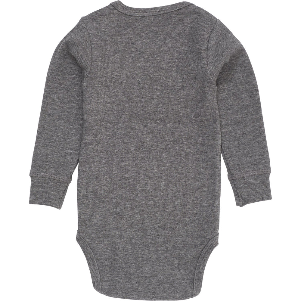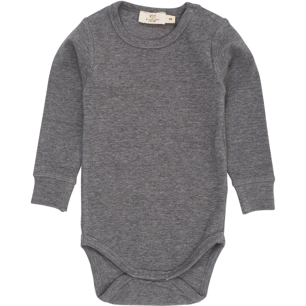 Introduce your little one to the ultimate blend of style and comfort with the Copenhagen Colors Grey Mel. Modal Rib Long-Sleeve Bodysuit. This cozy piece is crafted from a soothing mix of 47% organic cotton, 47% modal, and 6% elastane, ensuring softness and stretchiness. It sports a chic grey melange with a ribbed finish, long sleeves, and a classic round neckline for timeless elegance. The practical snap closures make diaper changes a breeze. Ideal for daily wear, this bodysuit combines functionality with a fashionable flair, making it a perfect staple in any infant's wardrobe.