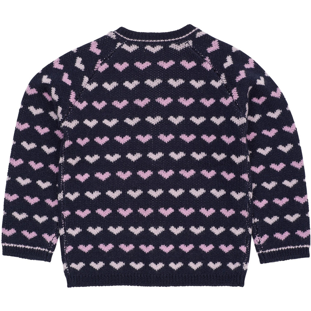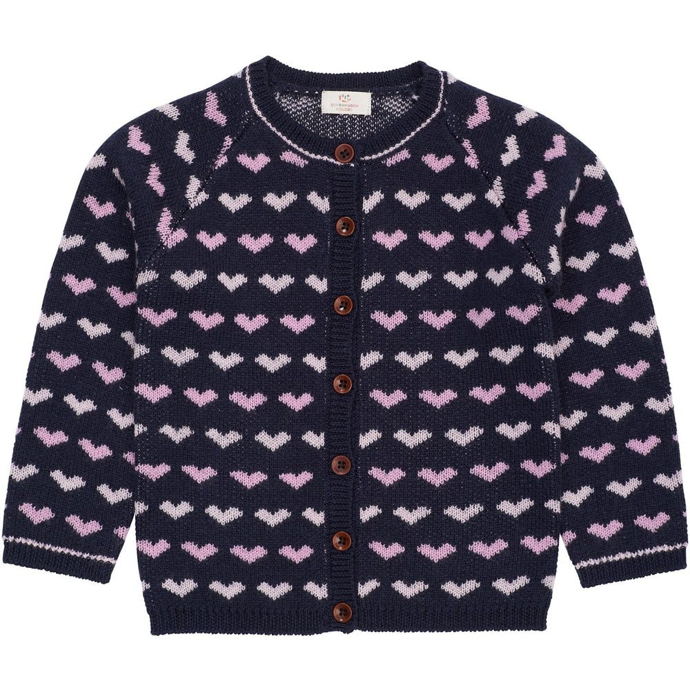 Discover the charm of our COPENHAGEN COLORS Navy/Bubblegum Comb Merino Heart Cardigan, perfect for your little one! Crafted from soft, 100% merino wool, this cozy cardigan features a delightful pattern of petite knitted hearts. With its classic navy hue complemented by playful bubblegum accents and a comfortable round neckline, it promises style and warmth. Ideal for both casual wear and special occasions, it's a versatile addition to any child's wardrobe.