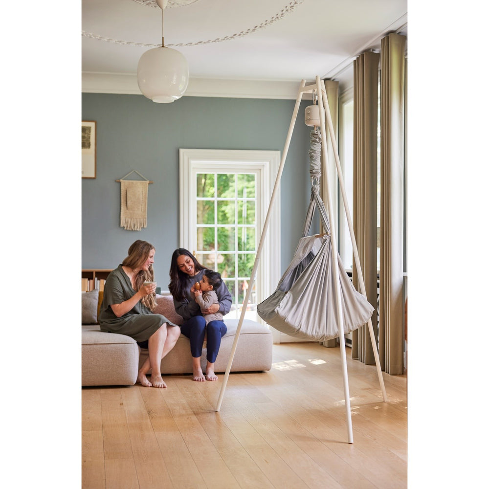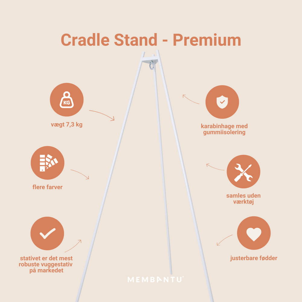 Brighten up your nursery with the MEMBANTU White Cradle Stand Premium, a perfect blend of style and functionality designed meticulously for your little one's comfort and safety. Without the need for tools, this simple setup allows you to easily mount the cradle and cradle bouncer, ensuring swift adaptability in any room or even outdoors. Crafted with Scandinavian elegance, its sleek design seamlessly integrates into any home décor while promising maximum stability, making it the most solid stand on the market. This stand not only supports serene sleep for your baby but also stimulates their sense of security with its robust architecture. Ideal for busy parents, this mobile solution enriches your baby’s nursery with both charm and practicality. Age: 0-10 months Materials: White Powder coated steel Measurements: 130x130x219 cm Washing instructions: Clean with damp cloth